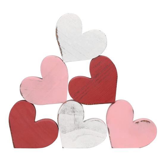 Полный набор для украшения ко Дню Святого Валентина: В этот набор входят 6 деревянных фигурок в форме сердец в классических цветах Дня святого Валентина: красном, розовом и белом.. Эти декоративные блоки, обладающие очарованием деревенского дома, мгновенно украсят ваш интерьер, создав уютную и праздничную атмосферу на многоярусных подносах, каминных полках или в прихожих.
