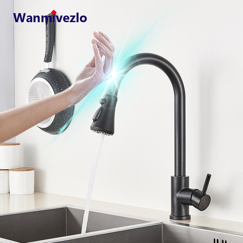 Черный сенсорный кухонный кран с интеллектуальным управлением, смеситель для настенного монтажа, поворот на 360 градусов, 3-ходовой распылитель, выдвижной смеситель Torneira — купить товар онлайн с бесплатной доставкой по всему миру!