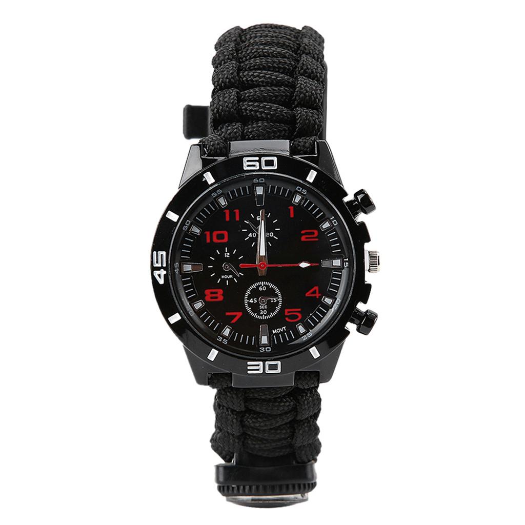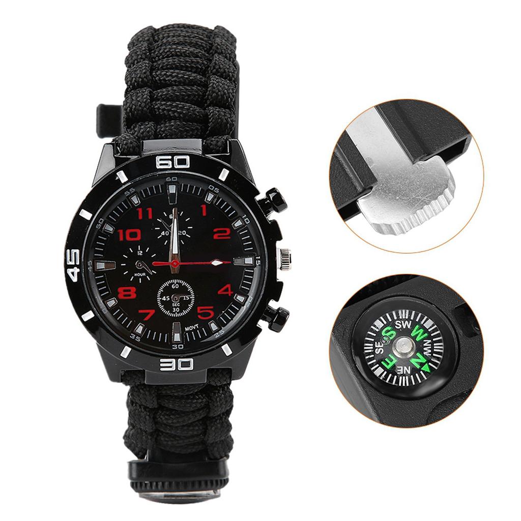 Часы для выживания в походе, оснащенные компасом, пожарным скребком из нержавеющей стали, аварийными ножами и свистком для выживания, могут изготовить очень прочную паракордовую веревку военного класса длиной 3,54 м и прочностью 550 фунтов.
