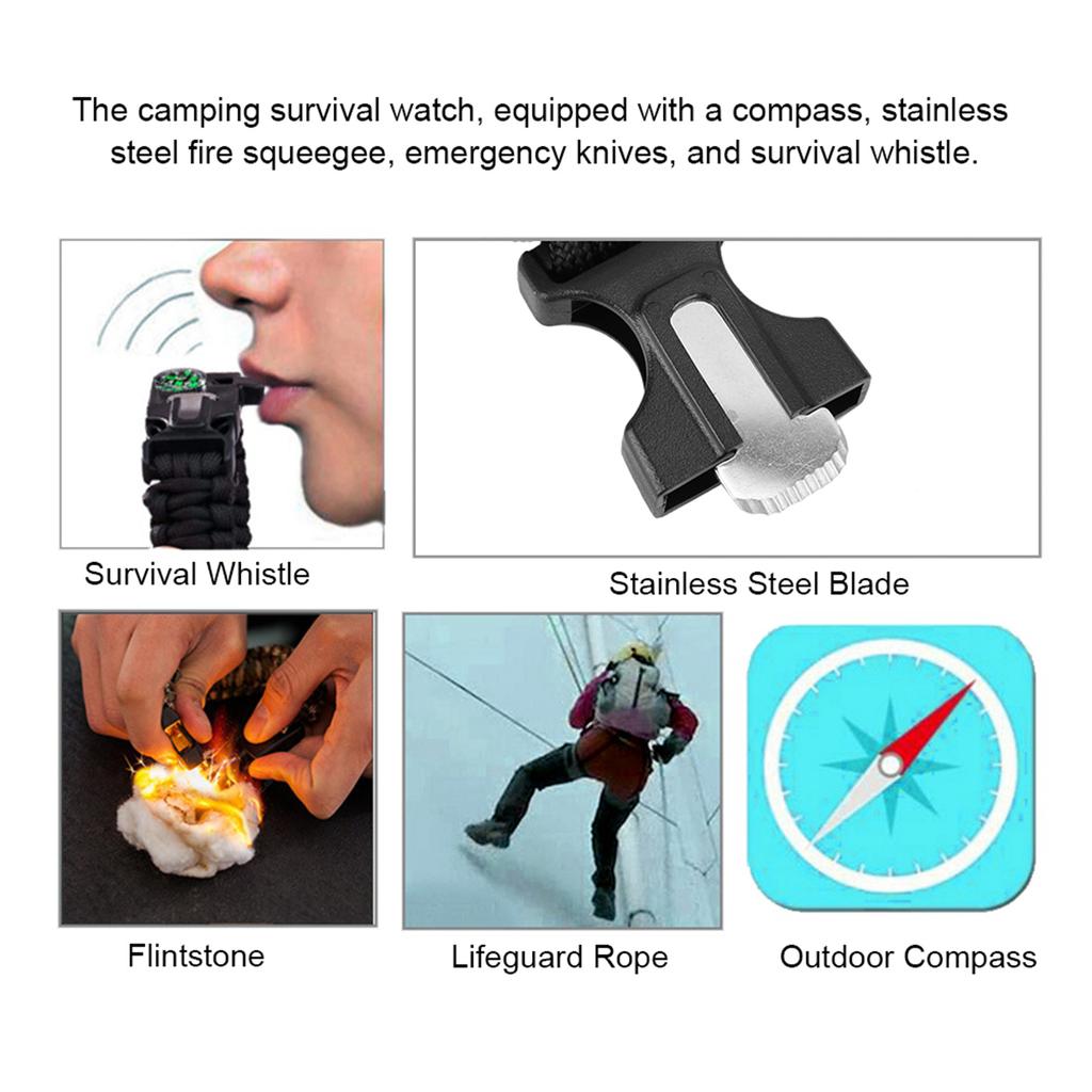 1. Часы для выживания в походе, оснащенные компасом, пожарным скребком из нержавеющей стали, аварийными ножами и свистком для выживания, могут изготовить очень прочную паракордовую веревку военного класса длиной 3,54 м и прочностью 550 фунтов.