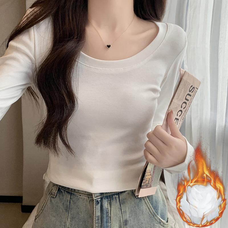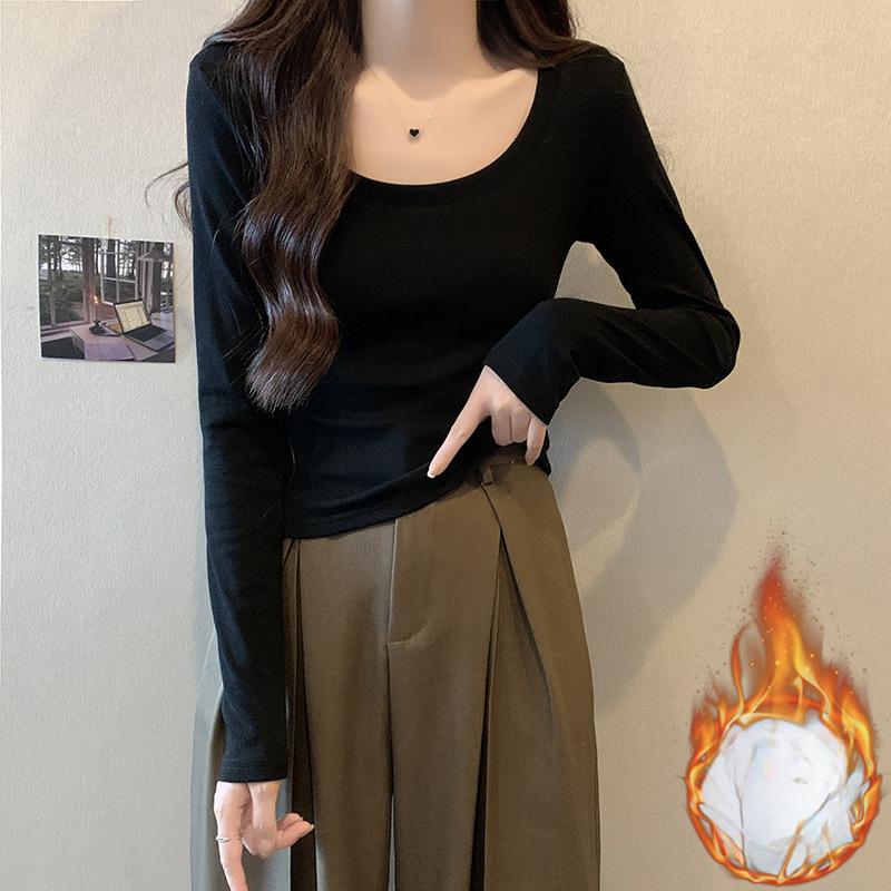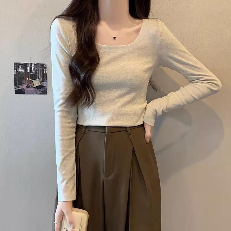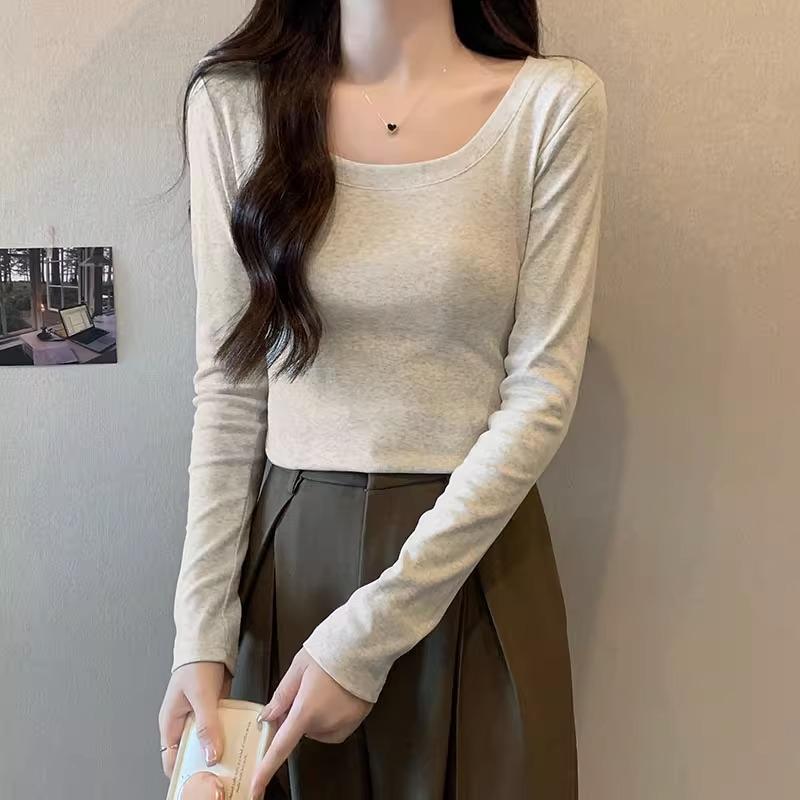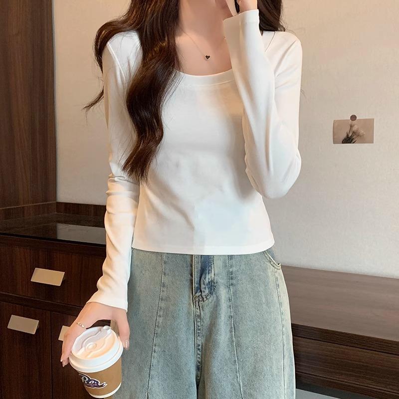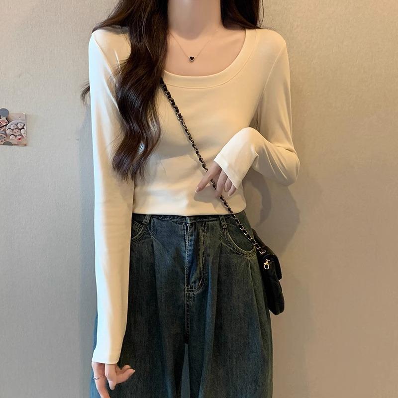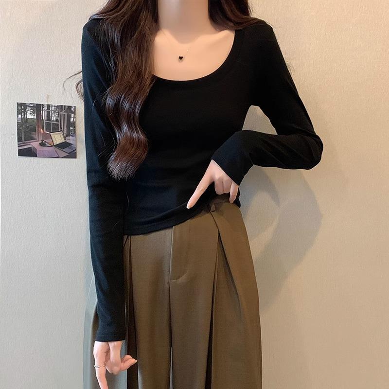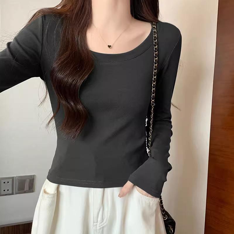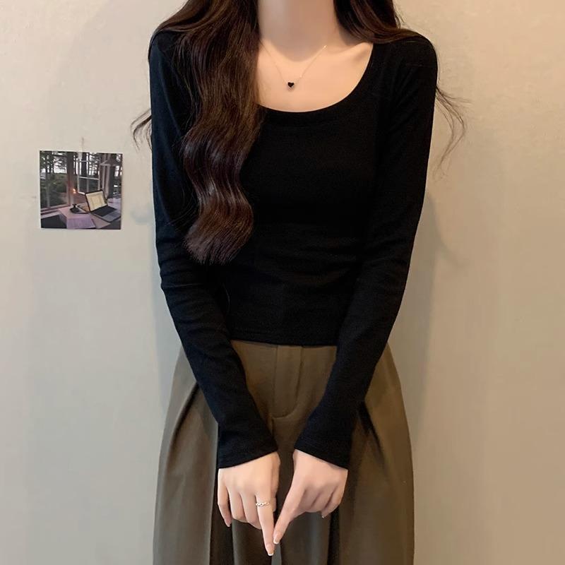 Ретро футболка с низким вырезом, на одно плечо, с длинными рукавами для женщин на начало осени, новый дизайн, с высокой талией, облегающая, короткая, топ с внутренним слоем