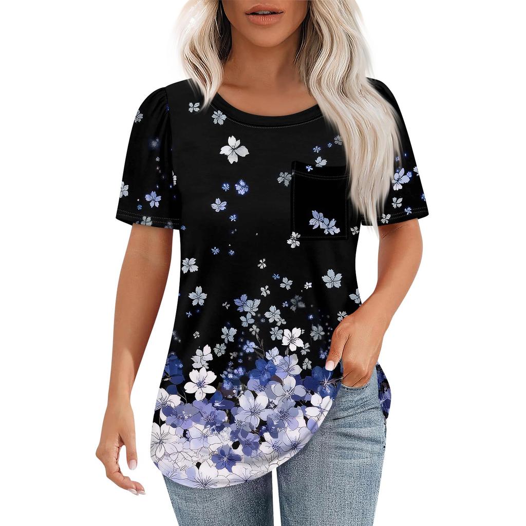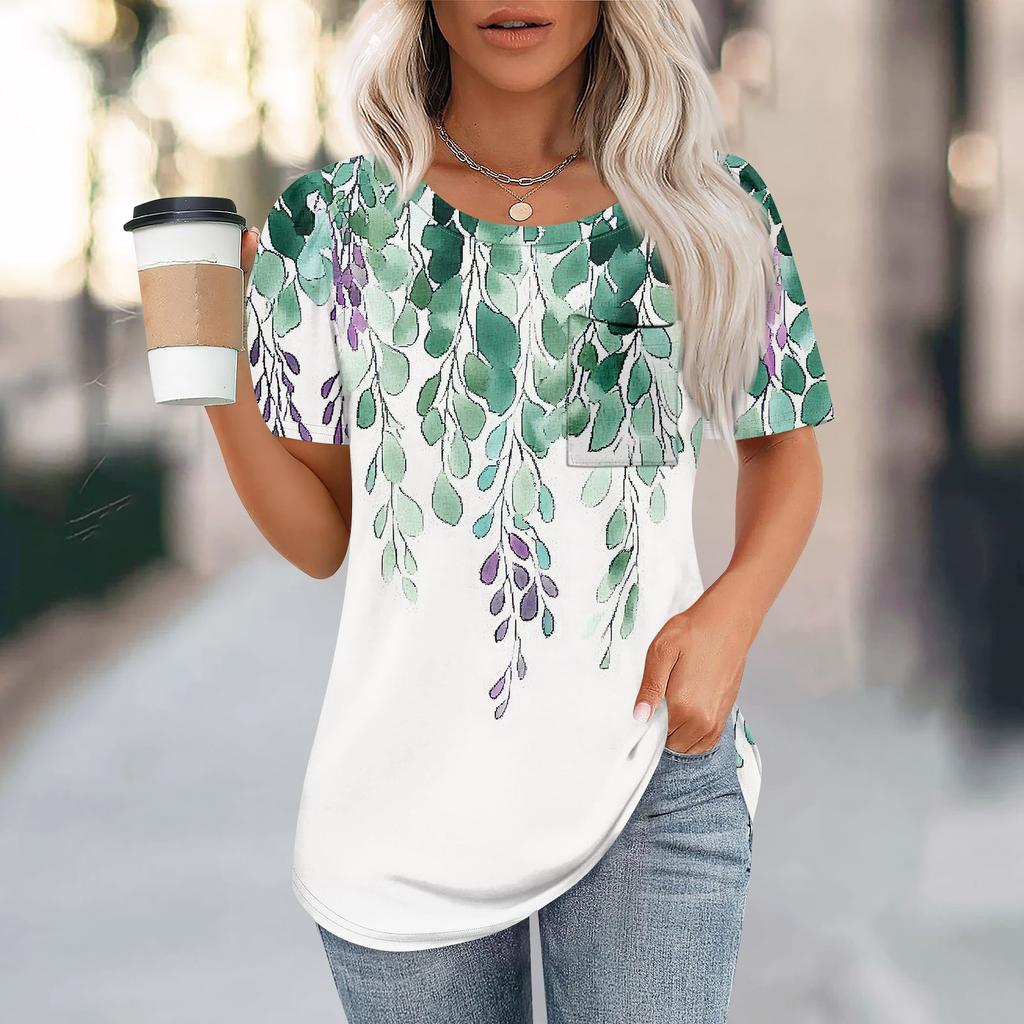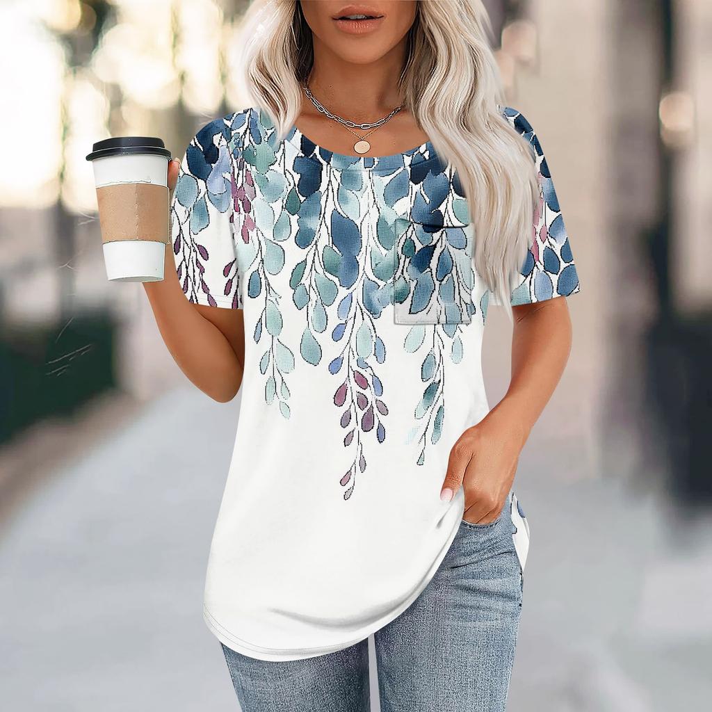 Футболки для женщин, плиссированные, с круглым вырезом, нарядные, повседневные, блузки с принтом, с коротким рукавом, летние топы, свободный крой