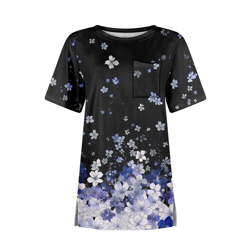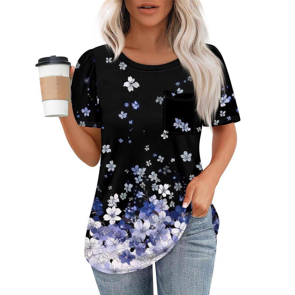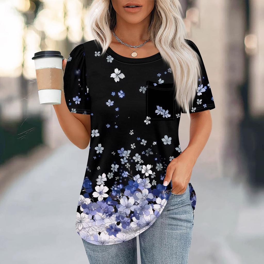 Футболки для женщин, плиссированные, с круглым вырезом, нарядные, повседневные, блузки с принтом, с коротким рукавом, летние топы, свободный крой