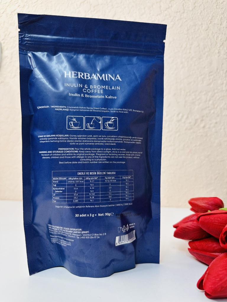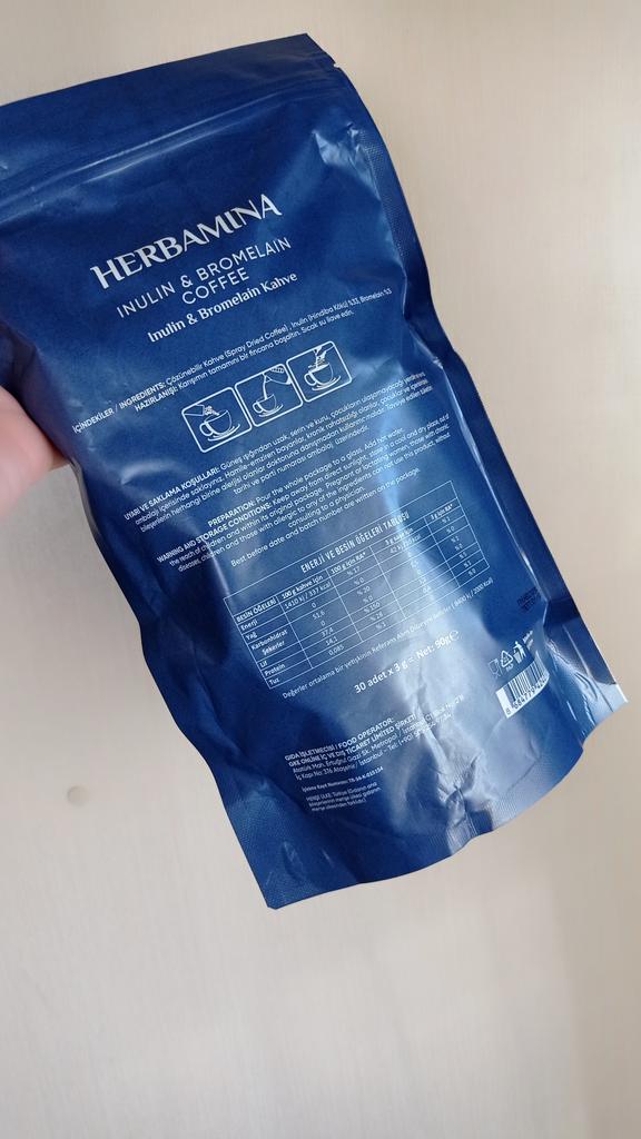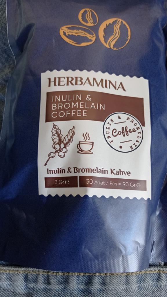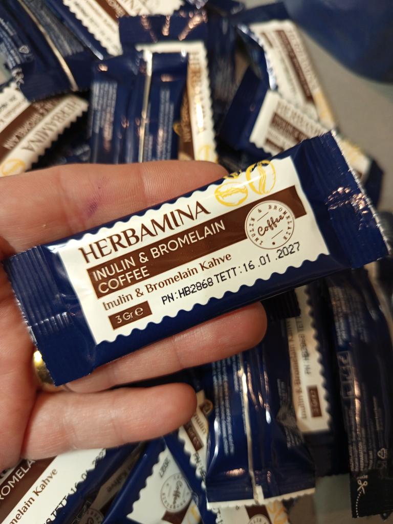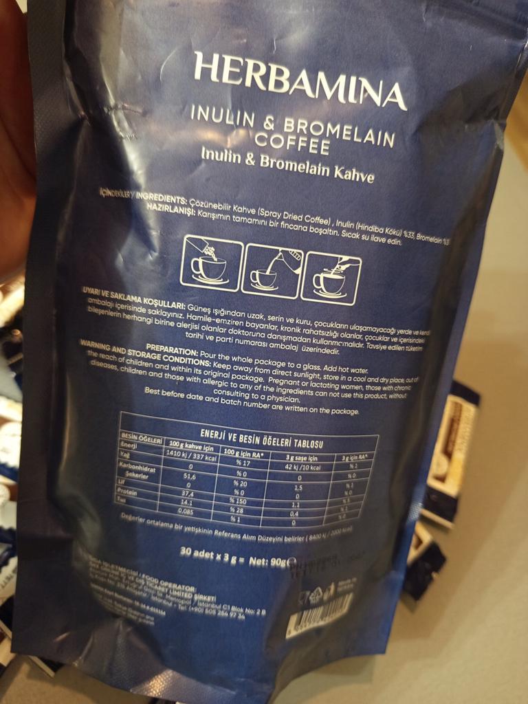 Herbamina Inulin & Bromelain кофе из Турции❤️🇹🇷 Описание продукта Herbamina Inulin & Bromelain Coffee — это растворимый кофе, обогащенный инулином и бромелаином. Упаковка содержит 30 порций по 3 г каждая, общий вес — 90 г. Основные компоненты и их польза • Инулин — натуральный пребиотик, который улучшает пищеварение, поддерживает здоровье кишечника и способствует лучшему усвоению питательных веществ. • Бромелаин — фермент, содержащийся в ананасе, известен своими противовоспалительными свойствами, способствует пищеварению и может помогать при похудении. • Кофе — естественный источник кофеина, который бодрит и улучшает концентрацию. Преимущества ✔ Улучшает пищеварение благодаря инулину и бромелаину. ✔ Поддерживает работу кишечника. ✔ Может способствовать метаболизму и снижению веса. ✔ Освежающий кофейный вкус с дополнительной пользой для здоровья. Как употреблять? Развести один пакетик (3 г) в горячей воде (около 150 мл) и размешать. Можно употреблять утром или в течение дня. Вывод Herbamina Inulin & Bromelain Coffee — это интересный вариант для тех, кто хочет сочетать удовольствие от кофе с пользой для здоровья, особенно для пищеварительной системы. Подходит для людей, следящих за своим питанием и метаболизмом.