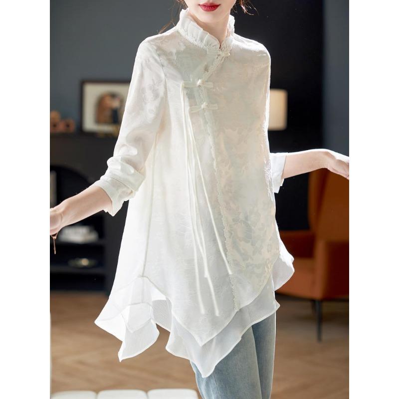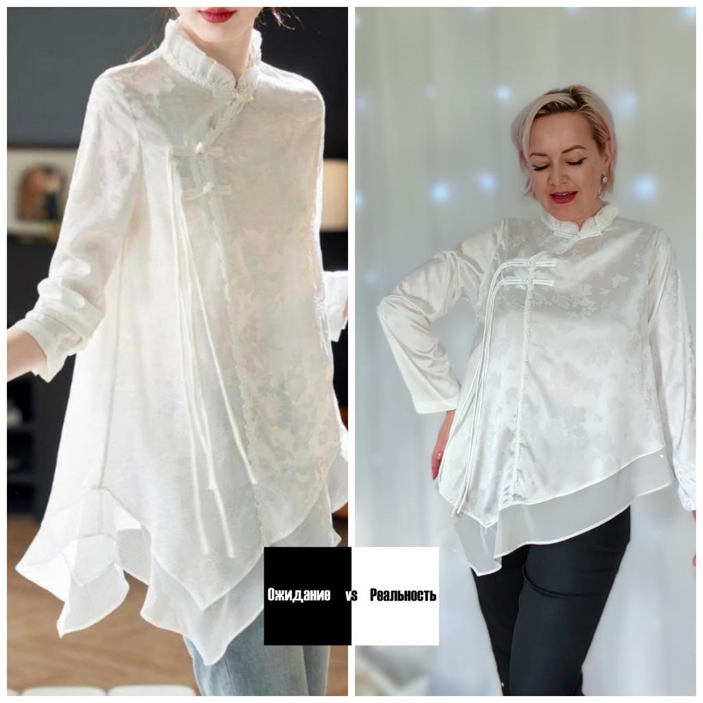 Шикарная блузка в китайском стиле. Привет! Какая же это приятная вещь девочки, даже если Вы далеки от такой эстетики, Вам она все равно понравится. Необычная и оригинальная. ‼️Добавила разговорное видео посмотрите перед покупкой там больше деталей ‼️ Ткань: Сшито из двух видов ткани : 1. Имитация мокрого шелка с рисунком на ткани при помощи специальной техники нанесения различными нитями, так что рисунок сложен именно из ниточек. Не тянется, не липнет к телу. 2. Шифон с прозрачным эффектом. Дизайн: Блузка ассеметричная застегивается на китайскую пуговку в виде узелка у ключицы. Украшением блузки так же являются длинные шнурки на груди, которые украшены характерными китайскими узелками. Размер: На мне XL Мои параметры : рост 172 см 98/76/106 см Детали : Длина 72 /84 см ОГ 110 см ОТ 126 см Плечи 39 см Длина рукава 60 см Резюмирую: Мне нравятся такие необычные вещи, могу смело рекомендовать. Берём. Я не прощаюсь, #M_K #мода_Китая