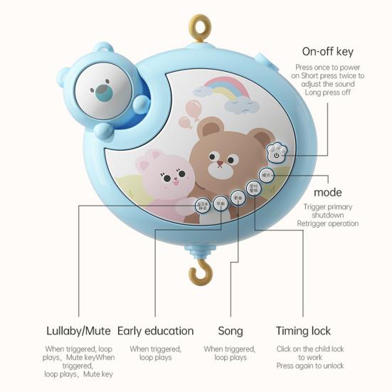 Музыкальная шкатулка воспроизводит множество нежных и тихих песен, которые помогают успокоить вашего малыша, уменьшить плач и улучшить качество сна, обеспечивая спокойный ночной отдых как для ребенка, так и для родителей.. Вращающаяся на 360 градусов игрушка-погремушка в виде животного специально разработана для игр и жевания малышей. Она изготовлена из экологически чистого АБС-пластика, не содержащего бисфенол-А, что гарантирует безопасность вашего малыша.