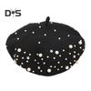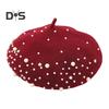 Женский берет с искусственным жемчугом и стразами, винтажная шерстяная шляпа в английском стиле без полей, однотонная, с регулируемыми лямками, кепка-тыква