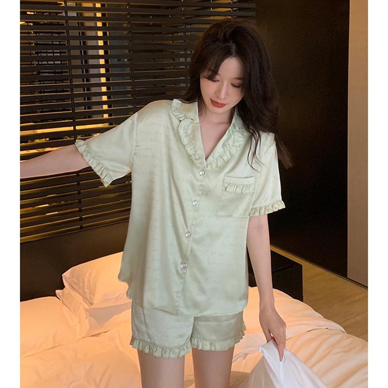 Летняя новинка, женская милая атласная шелковая пижама с цветочным принтом, короткий рукав + брюки, женская шелковая милая домашняя одежда, повседневная одежда