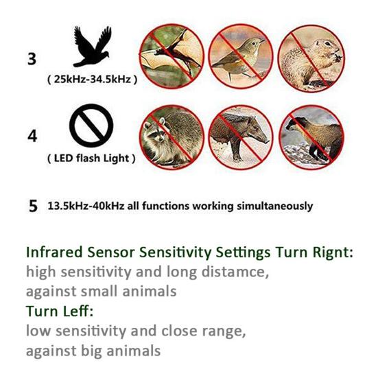 Этот отпугиватель легко устанавливается с помощью кронштейна для установки в землю или подвешивания на изгороди. Он идеально подходит для ферм, садов, дворов, фруктовых садов и т. д.. Благодаря широкому диапазону обнаружения в 110 градусов и 6-8 метров оптимальные результаты достигаются при постоянном использовании в течение 2-3 недель.. Попрощайтесь с нежелательными вредителями и защитите свое открытое пространство с помощью этого экологически чистого и эффективного решения.