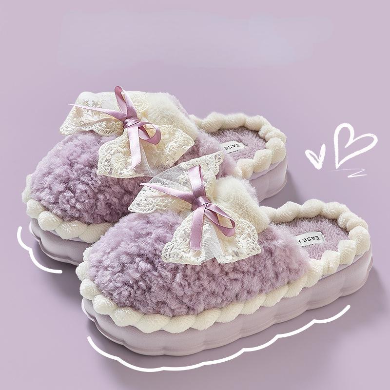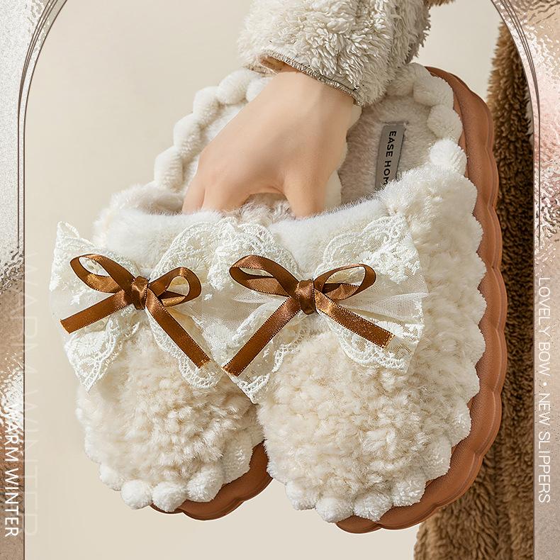 Хлопковые тапочки с бантиком для женщин, домашние зимние утепляющие нескользящие плюшевые тапочки на толстой подошве