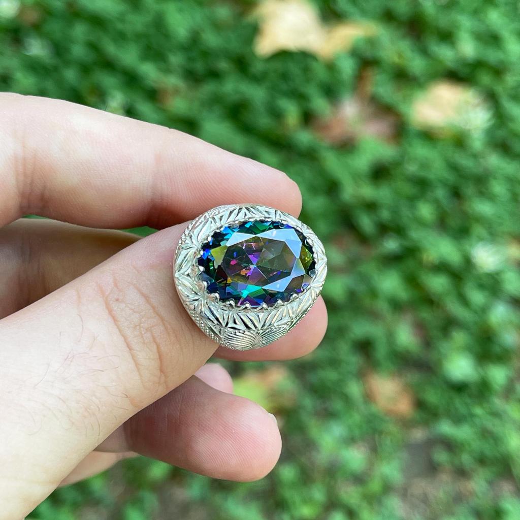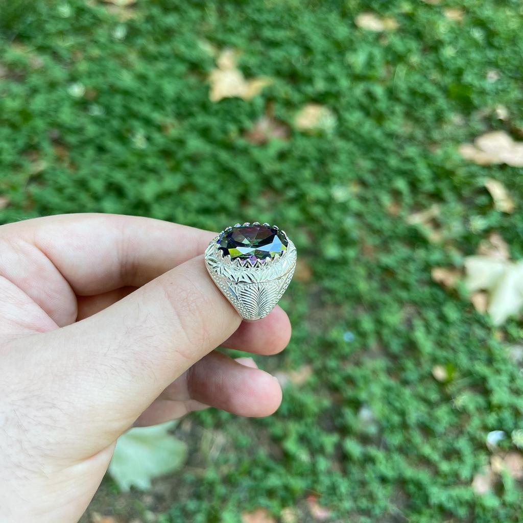 Подчеркните свой стиль с помощью этого изысканного мужского кольца Mystic Topaz, искусно изготовленного вручную из серебра 925 пробы премиум-класса.. Это кольцо, сочетающее в себе непреходящее мастерство и современную изысканность, — больше, чем просто украшение. Это воплощение элегантности и индивидуальности.