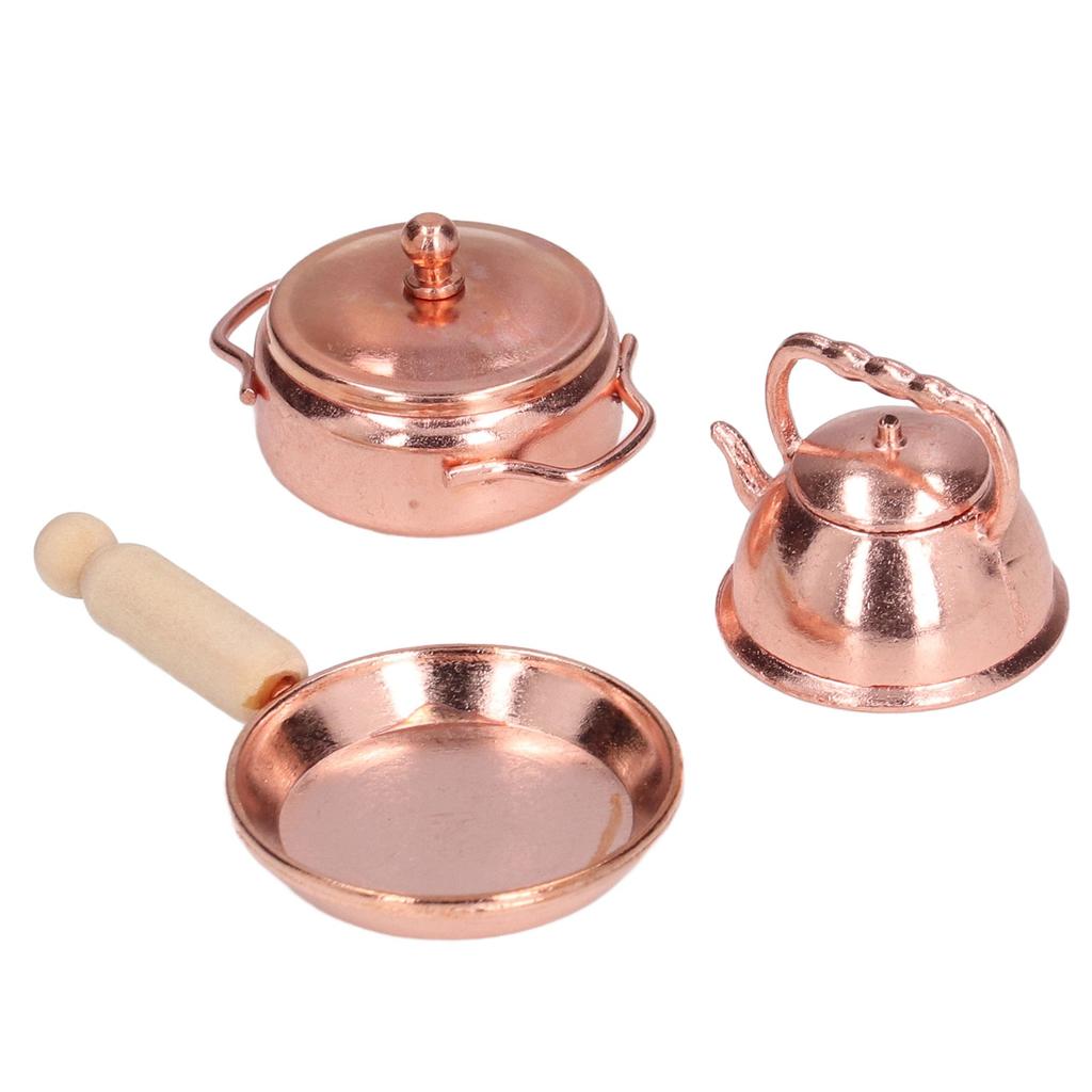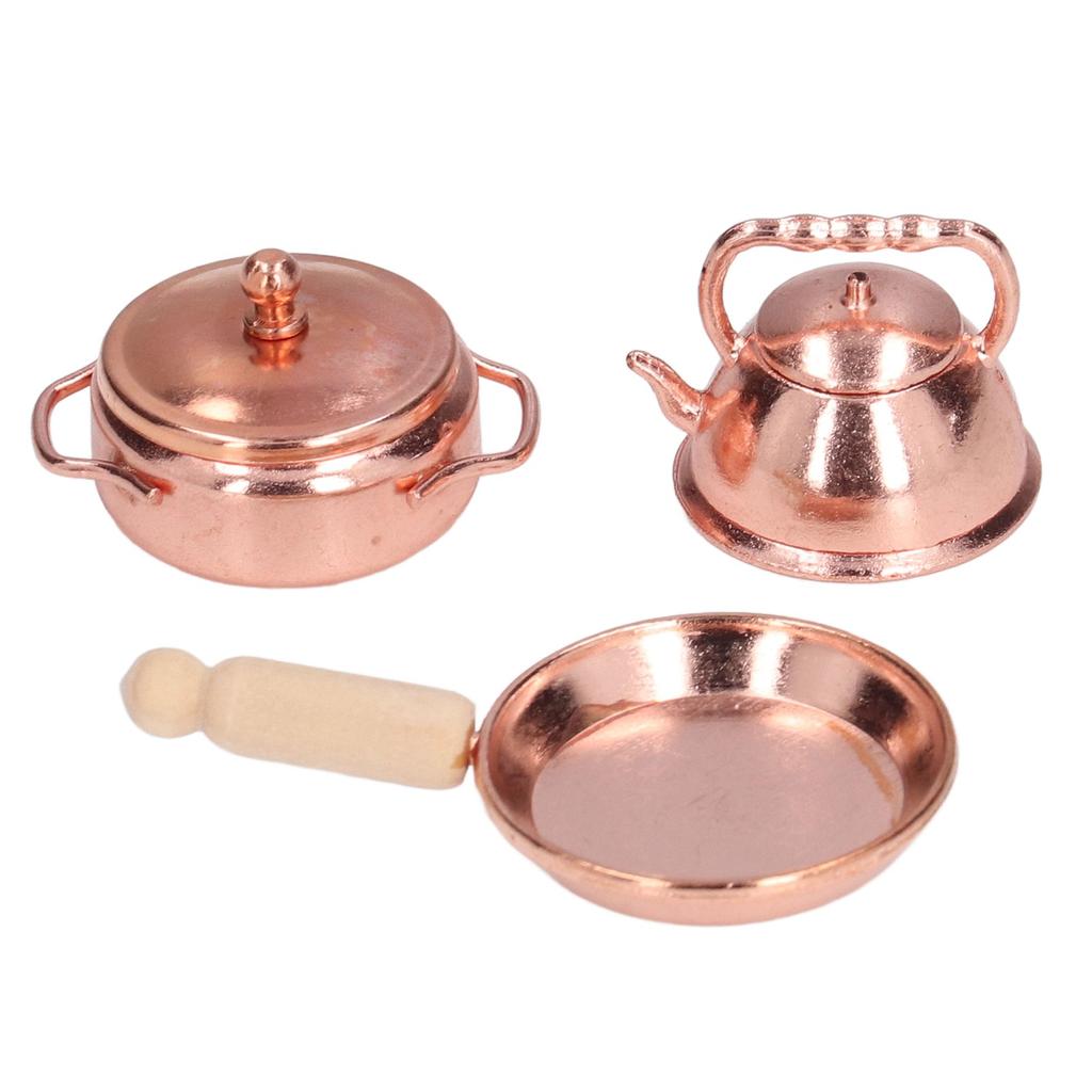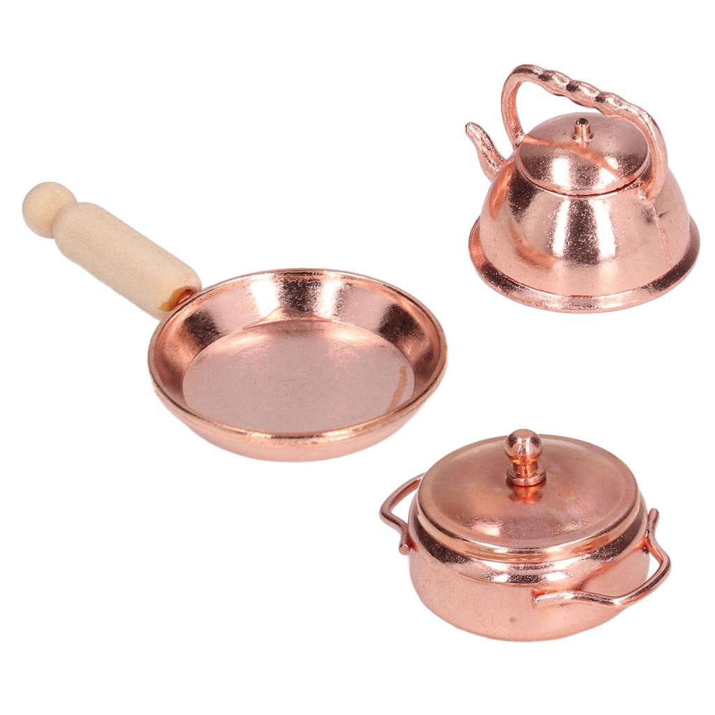 3шт 1:12 кукольных домиков, миниатюрная бронзовая сковорода, горшок, чайник, кухонный набор для приготовления пищи, набор кухонной посуды