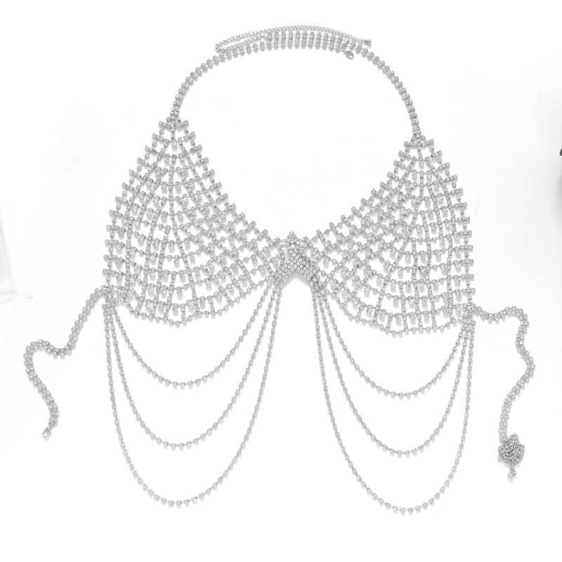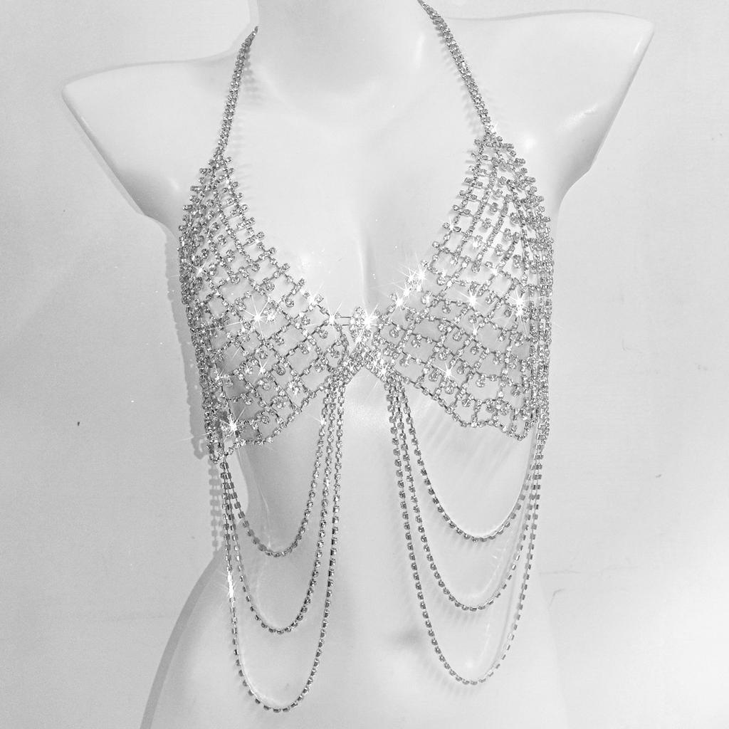 Модный бюстгальтер в стиле бикини с кисточками и вырезами, украшенный стразами, для ночного клуба, цепочка на тело для женщины.