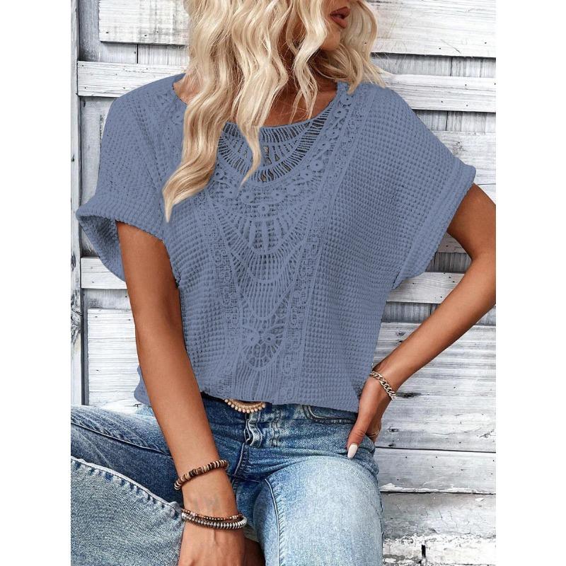 Весна Лето Кружева Сращивание Однотонные Свободные Повседневные Короткие Рукава Женская Одежда Футболки Женские