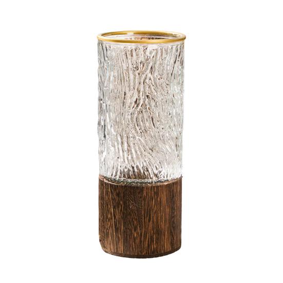 Изготовленная из высококачественного прозрачного стекла и украшенная деревенским деревянным основанием, эта ваза излучает элегантность благодаря гладкой стеклянной поверхности и отделке из натурального дерева.
