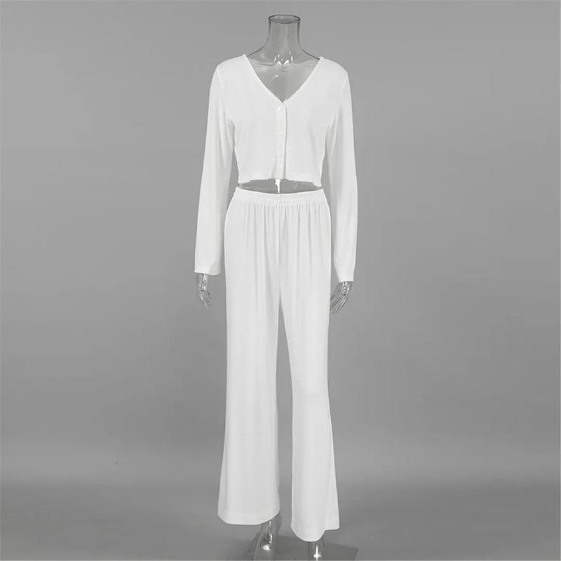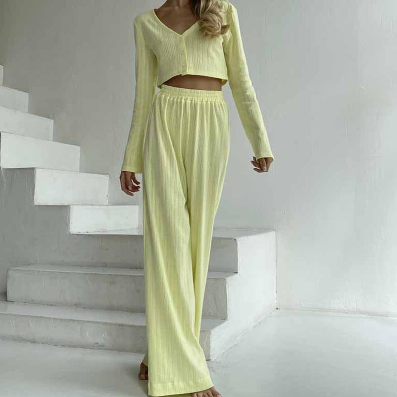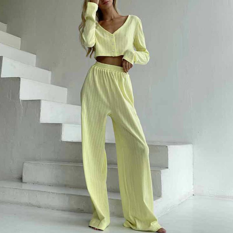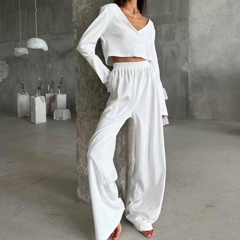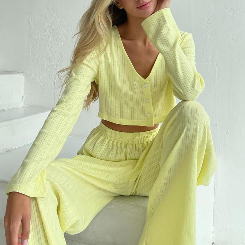 Повседневный однотонный костюм с V-образным вырезом, футболкой и брюками, укороченным топом с длинными рукавами, эластичной талией, широкими брюками, весенним домашним нарядом