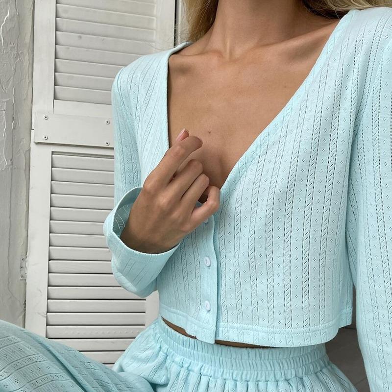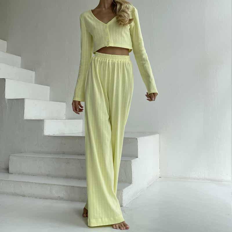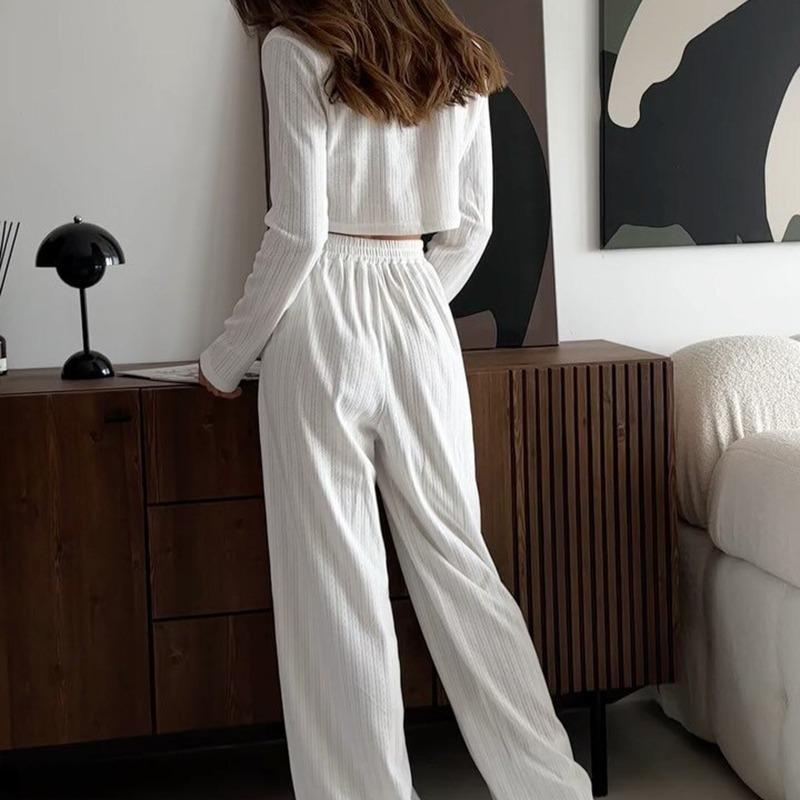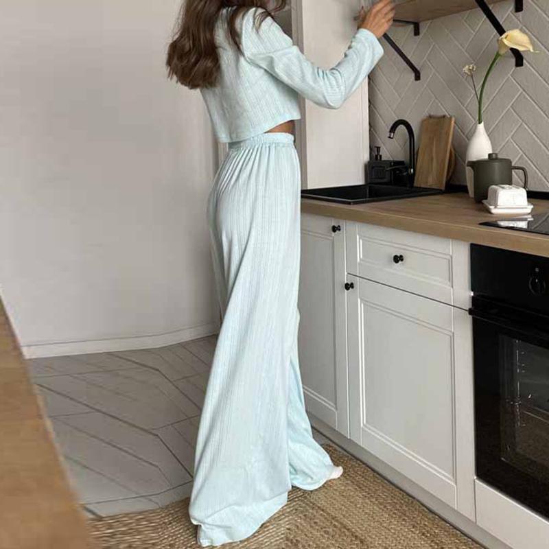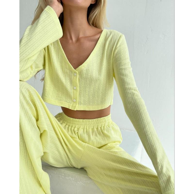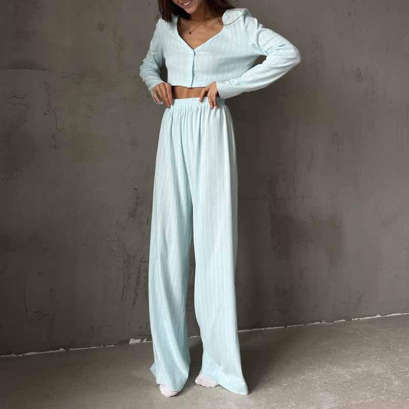 Повседневный однотонный костюм с V-образным вырезом, футболкой и брюками, укороченным топом с длинными рукавами, эластичной талией, широкими брюками, весенним домашним нарядом