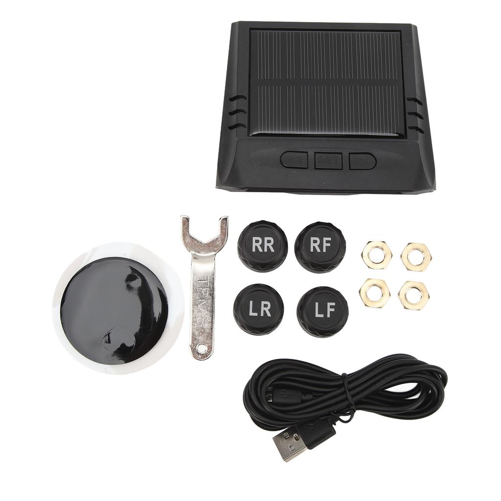 Солнечный монитор давления в шинах1 x USB-кабель4 x Датчик4 x Винт1 x Гаечный ключ1 x Противоскользящая наклейка1 x Руководство пользователяЖК-дисплей: Оснащен ЖК-дисплеем, обеспечивает точные данные о давлении и температуре для всех четырех шин, а также поддерживает сигнализацию избыточного давления и температуры.