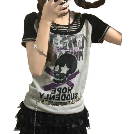 Футболки с черепами, женская уличная одежда в стиле панк, эстетика 2000 года, футболка для девушек в стиле гранж, готика, укороченный топ, узкая летняя одежда, графическая футболка