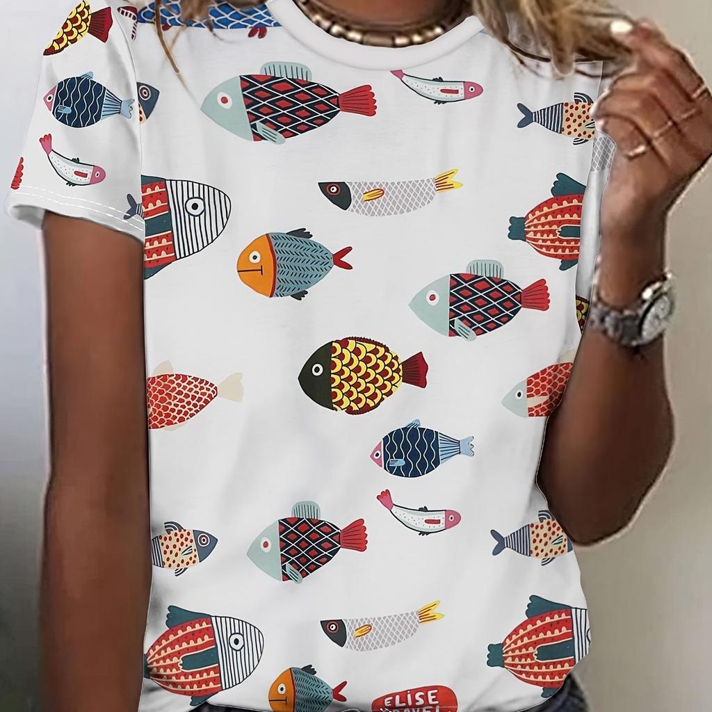 Женская футболка с короткими рукавами и художественным принтом «Рыбы», повседневный круглый вырез, полиэстер, машинная стирка — коллекция весна/лето, топ с короткими рукавами