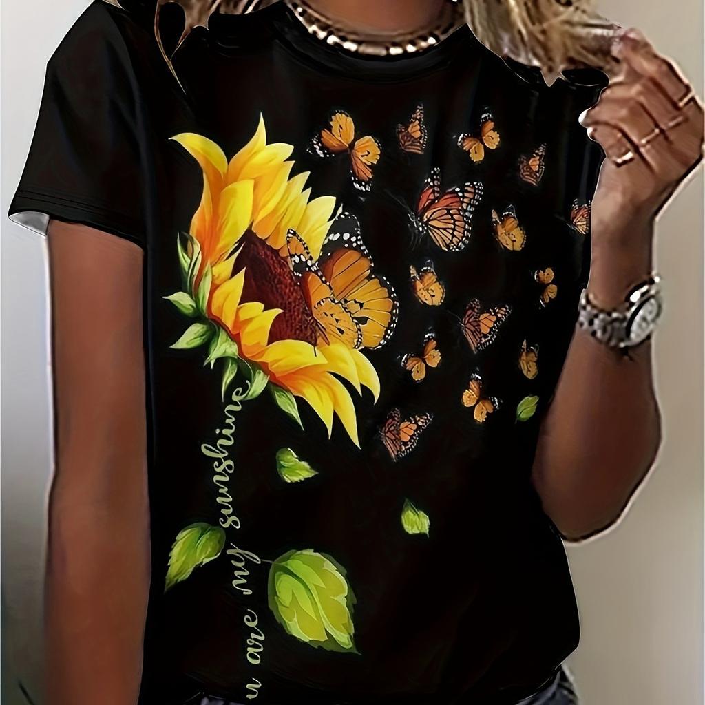 Футболка с коротким рукавом и принтом подсолнухов и бабочек, повседневная, с круглым вырезом, для весны и лета, женская одежда