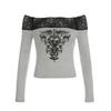 Женская футболка с длинным рукавом и темным ретро-принтом Clash Sexy Slim Lace Splicing на одно плечо
