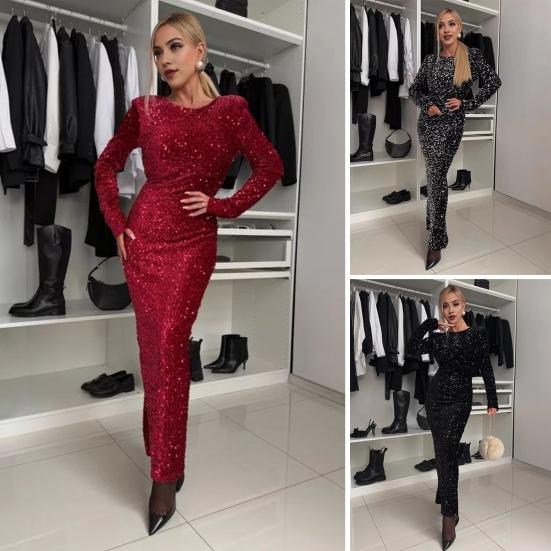 Дополните свой вечерний образ этим элегантным и модным платьем с круглым вырезом и длинными рукавами.. Платье, выполненное из сверкающих пайеток, имеет приталенный силуэт, открытую спину и очаровательный бант.. Идеально подходит для особых случаев, таких как вечеринки, танцы, банкеты и свадьбы..