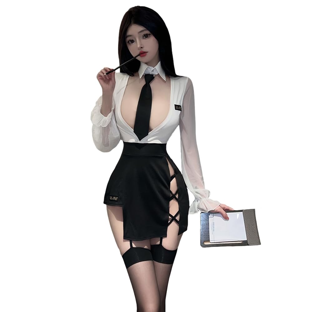 Секретарь OL Женщина Учительница Грудь Открытая Костюм Сексуальный Эротический Экстремальный Костюм На Хэллоуин Открытая Спина Длинный Рукав Прозрачный Разрез Белый Черный Костюм Наряд