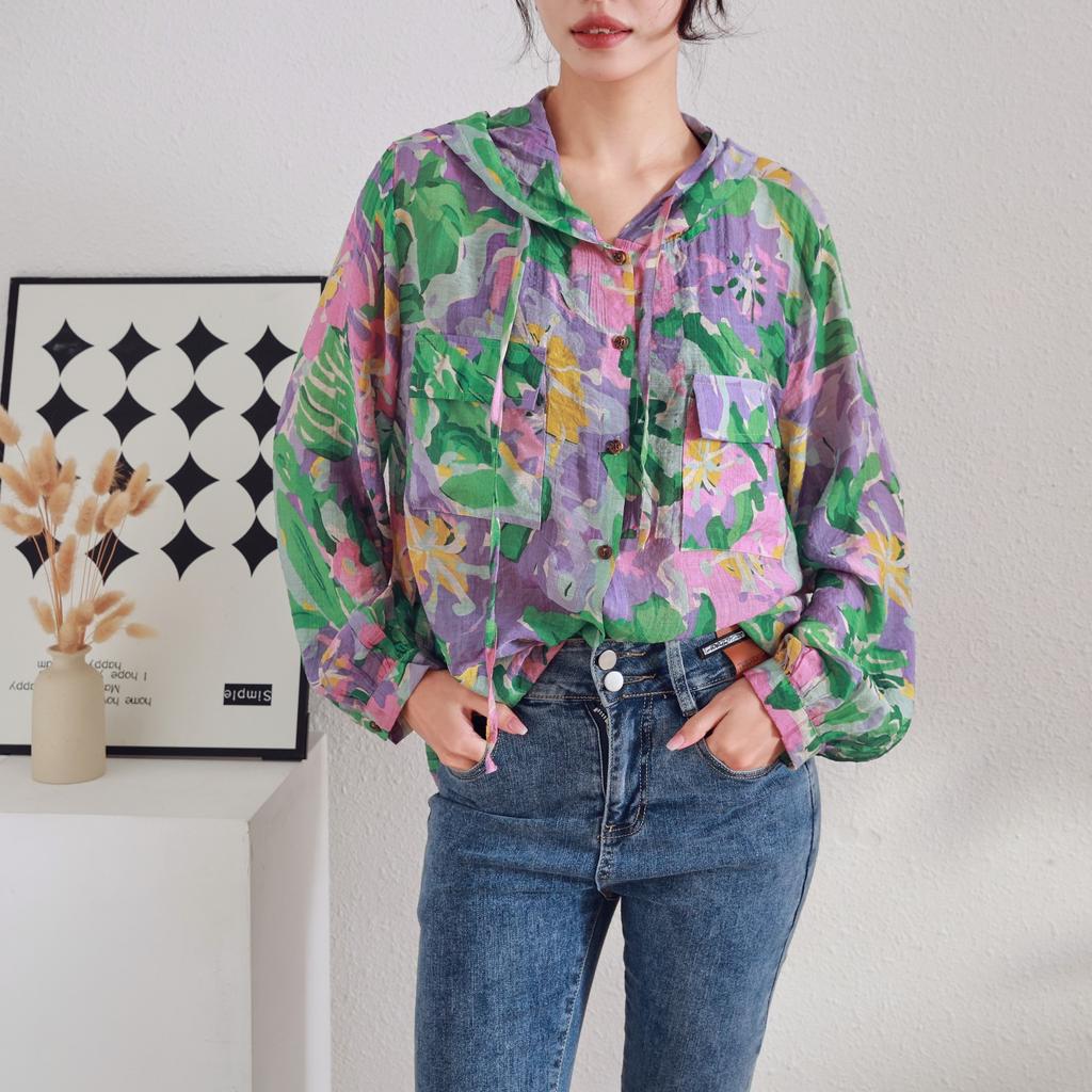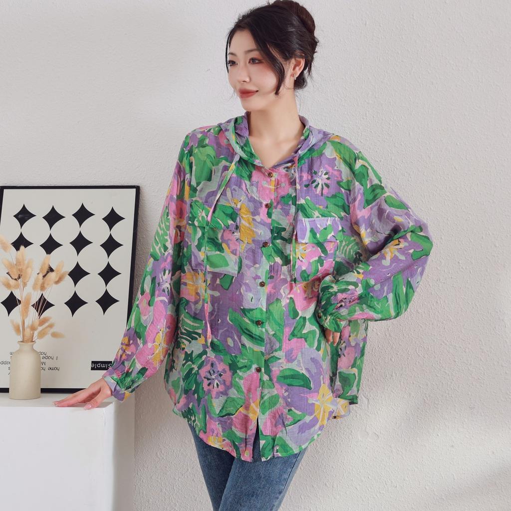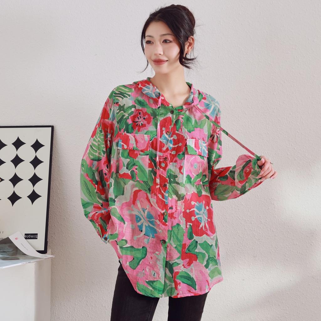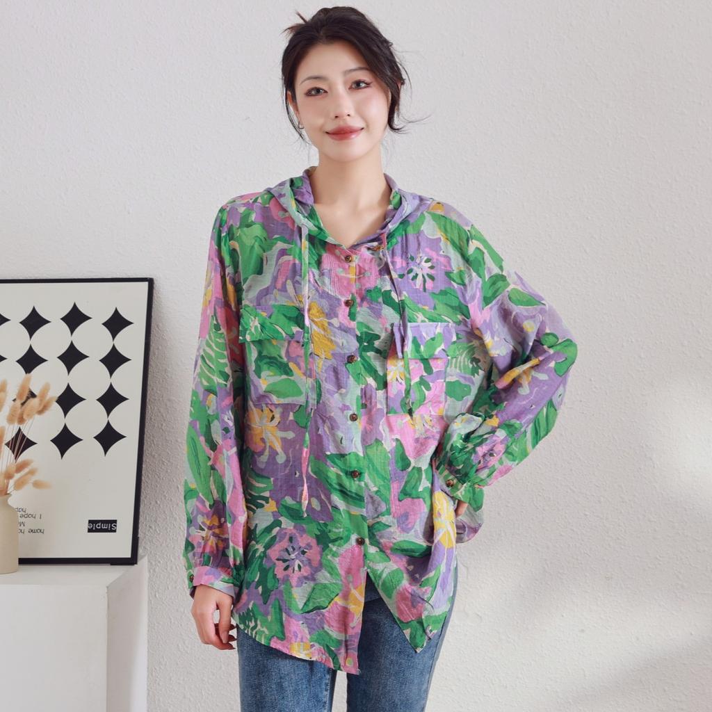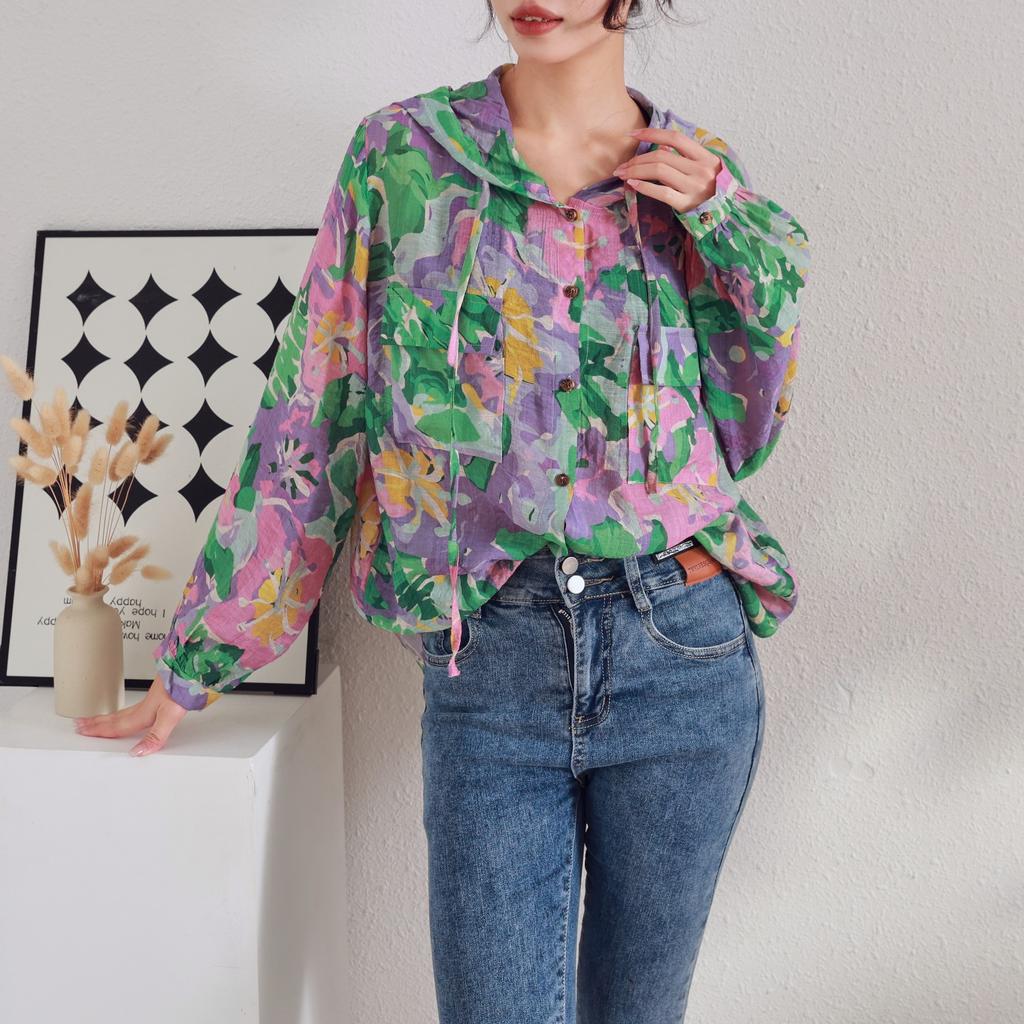 DIMANAF Весна 2025 Лето Льняная Рубашка С Длинным Рукавом С Капюшоном Женская Блузка Модные Цветочные Топы Свободные Новые