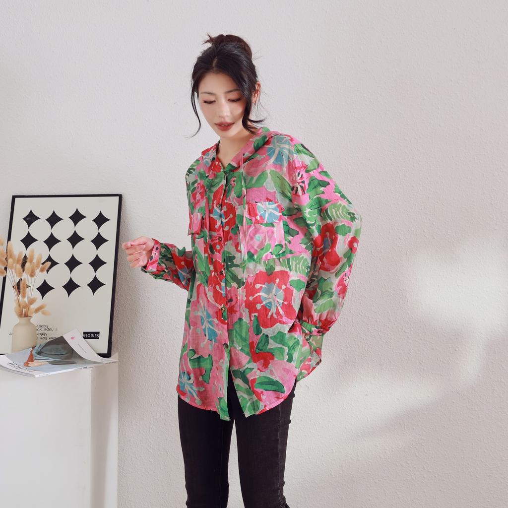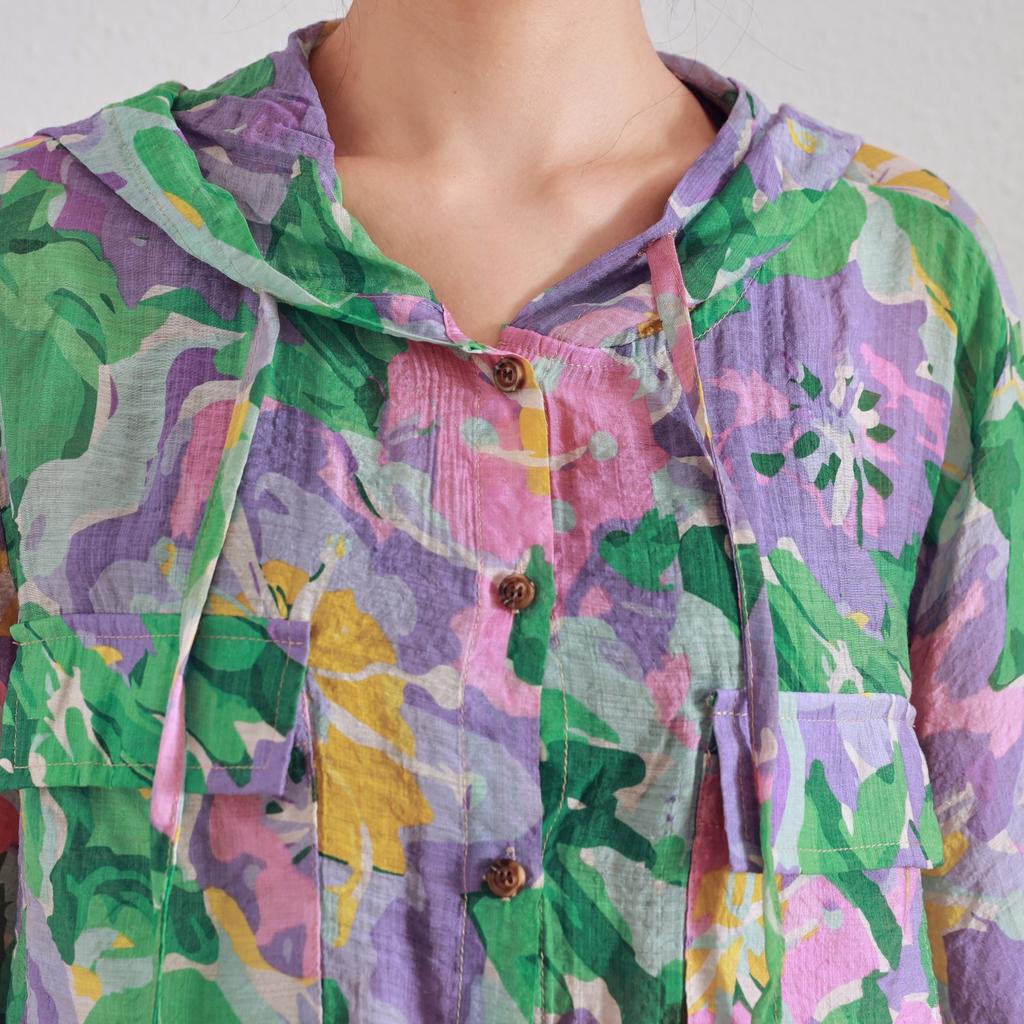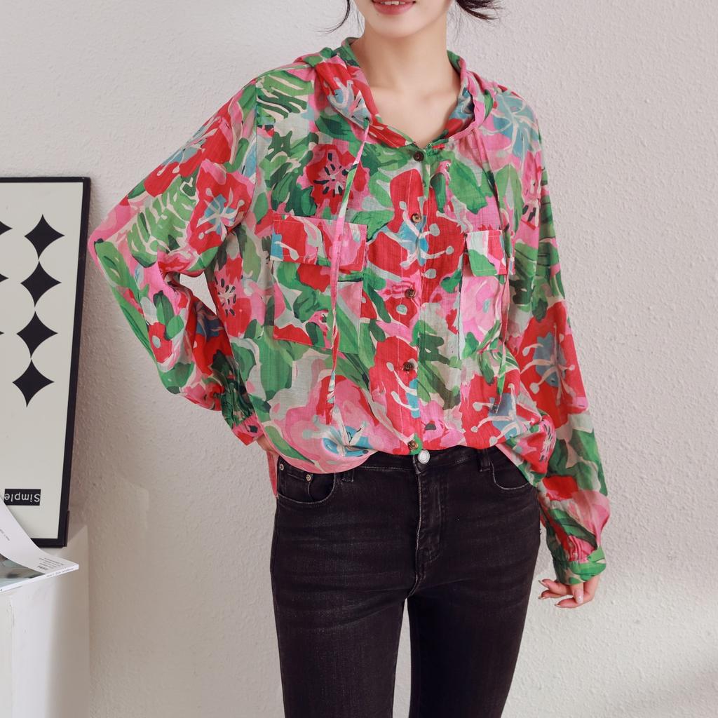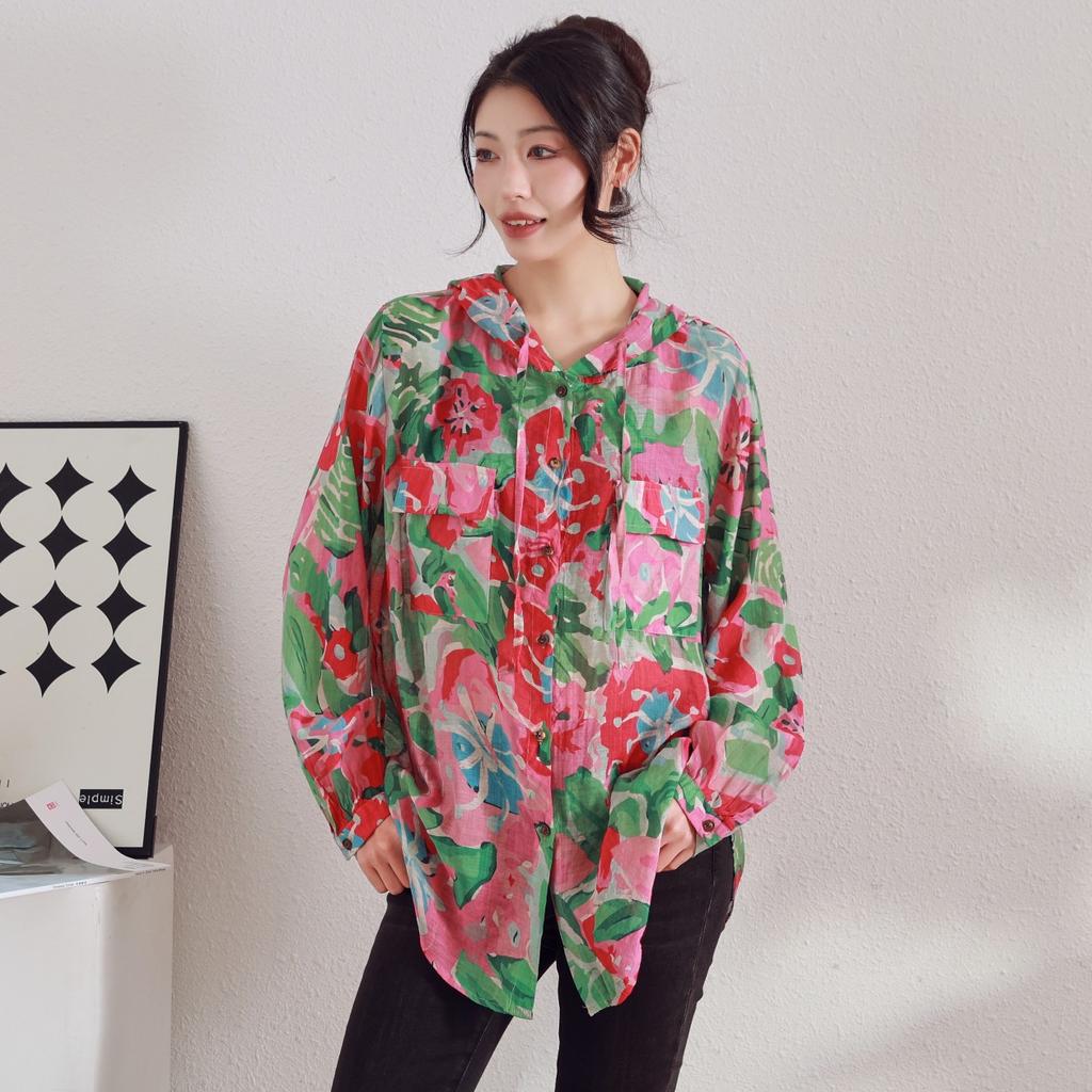 DIMANAF Весна 2025 Лето Льняная Рубашка С Длинным Рукавом С Капюшоном Женская Блузка Модные Цветочные Топы Свободные Новые