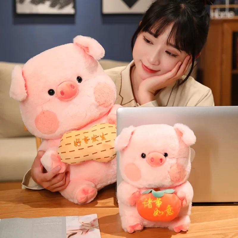 Мягкая игрушка в виде розовой свиньи Lucky, держащая арахис из хурмы, стоящая мягкая свинка с изображением мультяшного животного, праздничный подарок