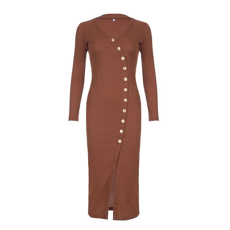 Осенне-зимние женские темпераментные платья с косым воротником и пуговицами, разрезом и тонким трикотажем