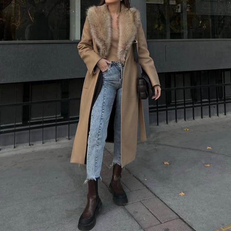 Повседневное теплое шерстяное длинное пальто со шнуровкой для женщин, осень-зима, элегантное пальто с лацканами и длинными рукавами, ветрозащитная куртка в стиле пэчворк