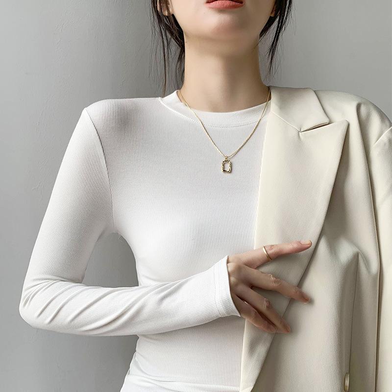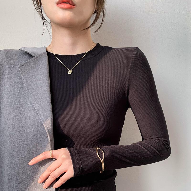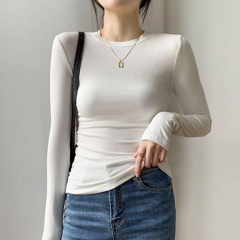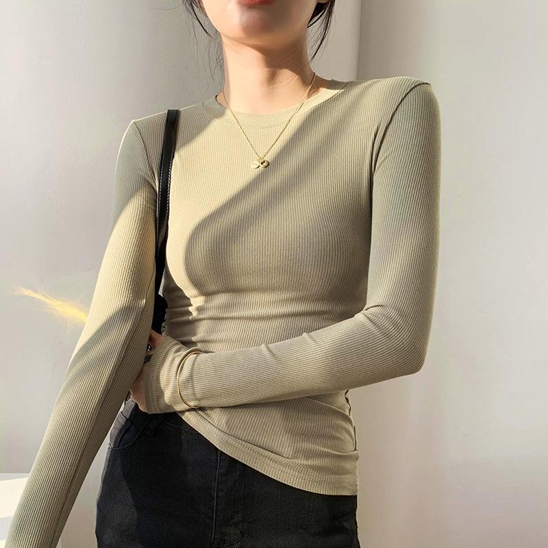 Высокоэластичная хлопковая нить с обтягивающим длинным рукавом, верхняя часть футболки на осень и зиму, новый тип плеча, маленькая круглая горловина, нижняя часть рубашки для женщин