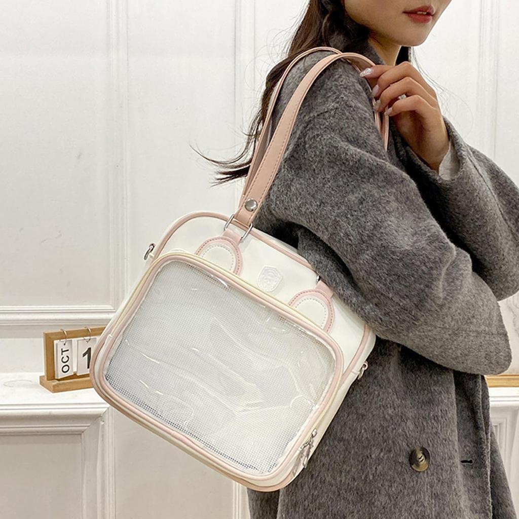 [Внешний вид] Квадратная сумка Ita имеет дизайн с прозрачным окном с одной стороны, а верхняя часть прозрачного окна украшена медвежьими ушками. Вы можете расположить внутри товары Moe, которые хотите выставить, по своему вкусу, а также защитить плюшевые игрушки от воды и пыли.. Сумка имеет двойную застежку-молнию.