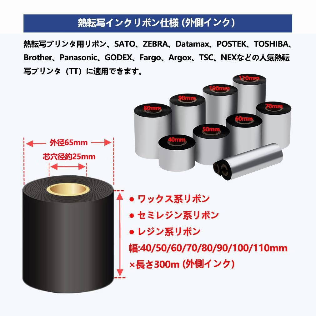 [Обзор продукта] Термотрансферная лента (внешние чернила) для термотрансферных принтеров этикеток, применимых к популярным термотрансферным принтерам, таким как SATO, ZEBRA, Datamax, POSTEK, Brother, TOSHIBA, Panasonic, GODEX, Fargo, Argox, TSC, NEX и т. д.. Красящие ленты для термотрансферных принтеров (термоленты) имеют разнообразные потребности рынка по мере расширения сфер применения, например, принтеры этикеток, принтеры бирок и принтеры карточек. Красящие ленты можно разделить на восковые, полусмоляные и смоляные, в зависимости от соотношения смешивания используемых материалов и структуры слоев.. У нас есть различные красящие ленты (термотрансферные ленты и термоленты) для термотрансферных принтеров, таких как принтеры этикеток, принтеры бирок и карточные принтеры. Мы предлагаем ленты, которые идеально подходят для каждой цели, например, ленты на основе воска и ленты на основе смолы, в зависимости от использования этикеток и бирок.. При покупке обратите внимание на сочетание материала основы этикетки и красящей ленты.