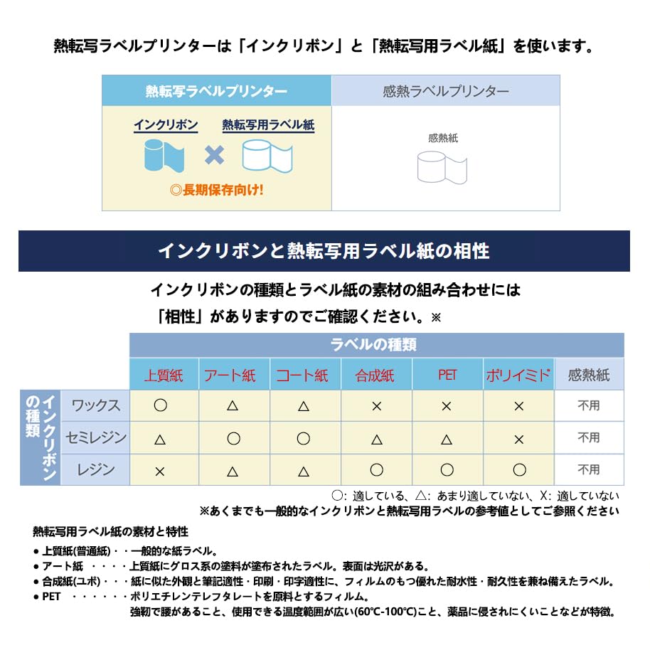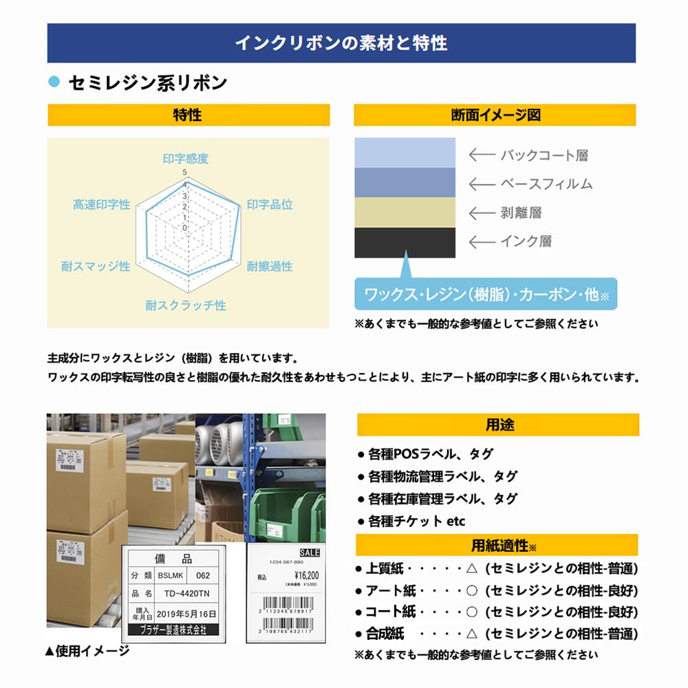 [Полусмоляная лента (восковая смола)] Функции: Состав чернил, основным компонентом которого является смола. Многие из них имеют многослойные композиции, которые сочетают в себе переносимость воска с устойчивостью смолы и используются для общих целей.. Он отличается превосходной высокой скоростью и устойчивостью к царапинам, а качество печати отличается высокой точностью и высоким качеством.. Приложения: Этикетки для управления логистикой, этикетки для управления запасами, этикетки для управления производственными процессами, этикетки для медицинских испытаний и т. д.. Бумага: Высококачественная бумага, мелованная бумага, литая мелованная бумага, синтетическая бумага, различные пленки, различные виды этикеточной бумаги и т. д.
