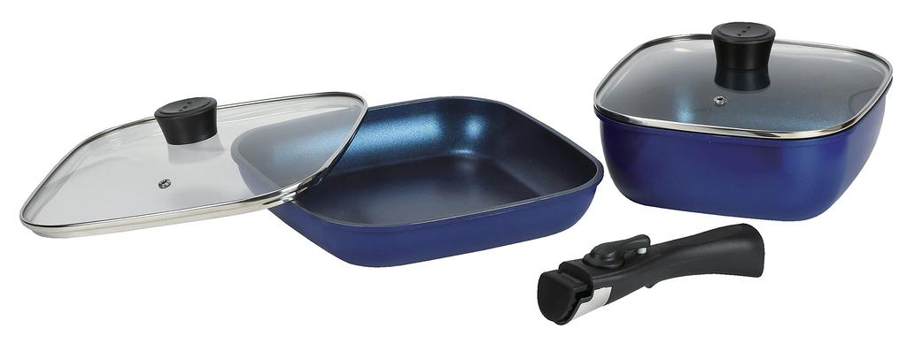 Размер товара: (ок.) Глубокая сковорода 20 х 20 см (квадрат) / ширина 21 x глубина 21 x высота 8 см, сковорода 24 x 24 см (квадрат) / ширина 25 x глубина 25 x высота 4,5 см, стеклянная крышка 20 x 20 см/ширина 21,5 x глубина 21,5 x высота 5,5 см, стеклянная крышка 24 x 24 см/ширина 25,5 x глубина 25,5 x высота 4 см, специальная ручка/общая длина 19 x ширина 4,5 x высота 5,5 см