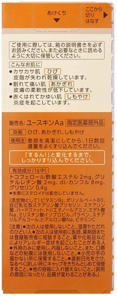 ●Название бренда: Юскин Аа ●Категория: Назначенный квази-лекарственный препарат ●Эффективность: Трещины, обветривающиеся участки, обморожения ● Четыре активных ингредиента лечат трещины, обветривающиеся участки и обморожения (назначенный квази-наркотик). ●Два увлажняющих ингредиента обеспечивают увлажнение вашей кожи. ●Желтый цвет крема – это цвет «витамина В2», одного из водорастворимых витаминов.. ●Освежающий аромат - это аромат активного ингредиента "DL-камфора". ●Ваша кожа будет увлажнена сразу после нанесения, а превосходный увлажняющий эффект продлится. ●Если средство подходит вашей коже, вы можете использовать его на всем теле.. ●Это удобный для переноски "тюбик для прогулок". ●Простой в использовании колпачок с одним нажатием. ●Если снять колпачок, можно пользоваться до конца.. Меры предосторожности при использовании ● Чего не следует делать (Если вы не будете следовать этим правилам, ваши текущие симптомы могут ухудшиться или побочные эффекты могут проявиться более легко.) (1) Следующие люди не должны использовать этот продукт. Люди с сильной сыростью или язвами ● Консультация 1. Следующие категории лиц должны проконсультироваться с врачом, фармацевтом или зарегистрированным продавцом перед использованием. Люди, у которых были аллергические симптомы из-за лекарств или косметики 2. Если после использования на коже появятся следующие симптомы, это может быть побочным эффектом, поэтому немедленно прекратите использование продукта и отнесите коробку и продукт своему врачу.