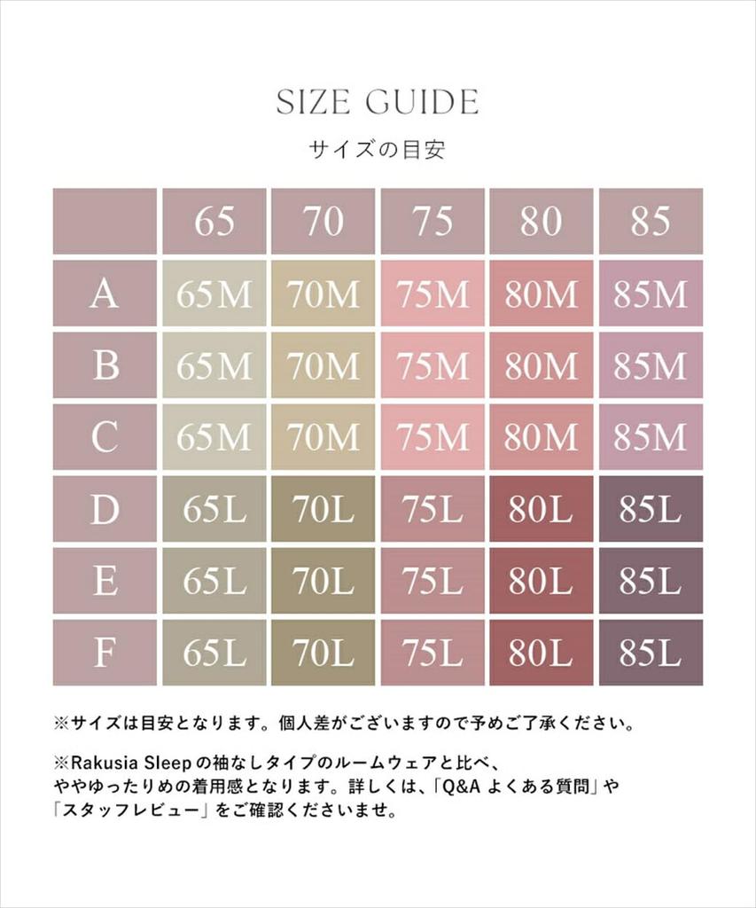 [Совместимые размеры] 65M: А65 В65 С65, 65Л: Д65 Е65 Ф65, 70М: А70 В70 С70, 70л: Д70 Е70 Ф70, 75М: А75 В75 С75, 75Л: Д75 Е75 Ф75, 80М: А80 В80 С80, 80л: Д80 Е80 Ф80, 85М: А85 В85 С85, 85Л: D85 E85 F85 *Совместимые размеры приведены только для справки.. Обратите внимание, что существуют индивидуальные различия.. *По сравнению с домашней одеждой без рукавов Rakushia Sleep, она кажется немного свободнее.