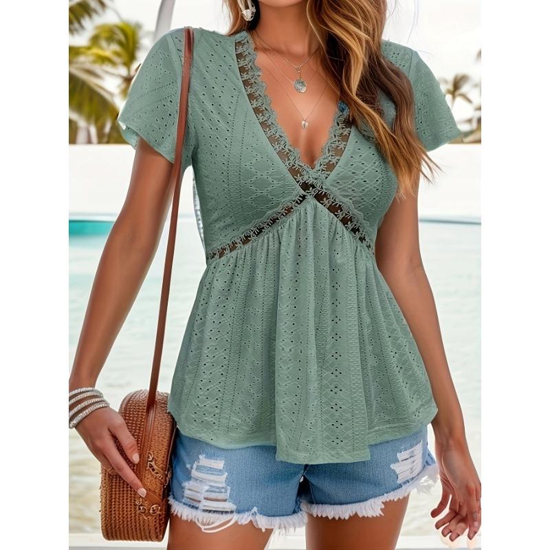 Женская летняя новая футболка с короткими рукавами из жаккарда, топы из кружева с V-образным вырезом