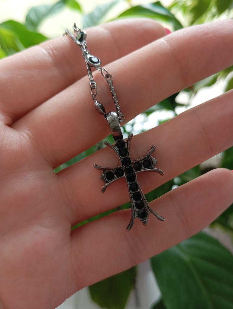 ▪️▪️▪️ Готическое ожерелье - чокер ▪️▪️▪️ 🕸 Идеально дополнит однотонные блузки/платья/светлые водолазки. 🕸 Стильная и необычная двойная цепочка с крупной подвеской в виде креста. 🕸 Товар соответствует промо-фото. 🕸 Чёрные стразы красиво переливаются на солнце. 🕸 Цепочка кажется грубой, скорее за счёт чёрного цвета, кожу не царапает и почти не ощущается на теле. 🕸 Замок - карабин. 🕸 Есть цепочка на удлинение. 🕸 Товар прилетел в зип-пакете. 🕸 Цена на момент заказа составила всего лишь 90 рублей, сейчас гораздо дороже 🤷🏼♀️ 🕸 Доставка отслеживалась до почты. 🌟🌟🌟🌟🌟 Удачная покупка 🌟🌟🌟🌟🌟
