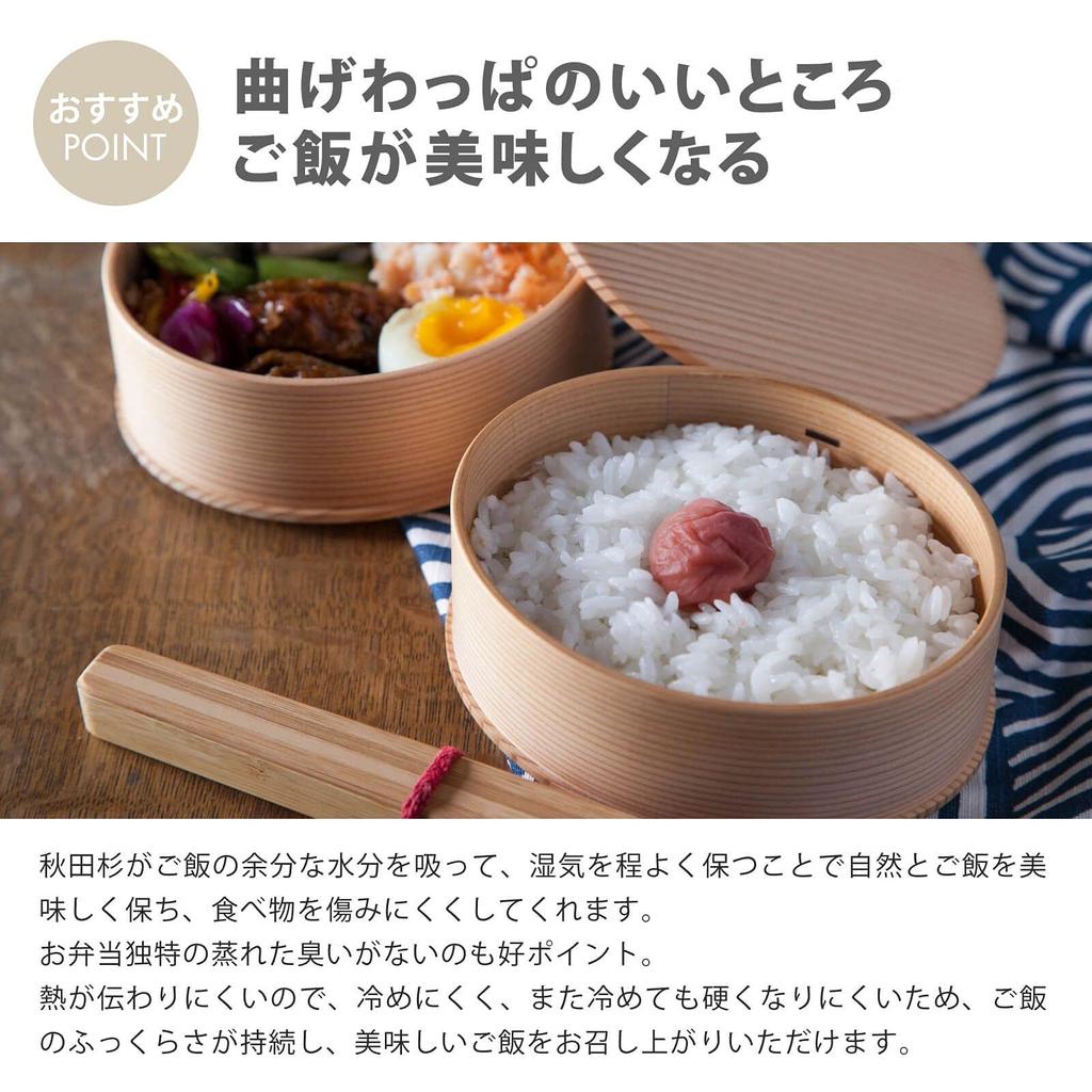 [Рекомендуемые пункты для магеваппы из акиты] Кедр акиты впитывает излишки воды из риса и ингредиентов и регулирует влажность внутри бэнто, естественным образом сохраняя вкус риса и делая еду менее болезненной. Масу. Еще один плюс в том, что он не источает затхлый запах, типичный для коробок для бэнто.. Поскольку древесина плохо проводит тепло, она не так быстро остывает, а ее способность контролировать влажность не позволяет рису стать жестким или размокшим даже после остывания, поэтому вы можете наслаждаться вкусным рисом, который остается рассыпчатым в течение длительного времени.