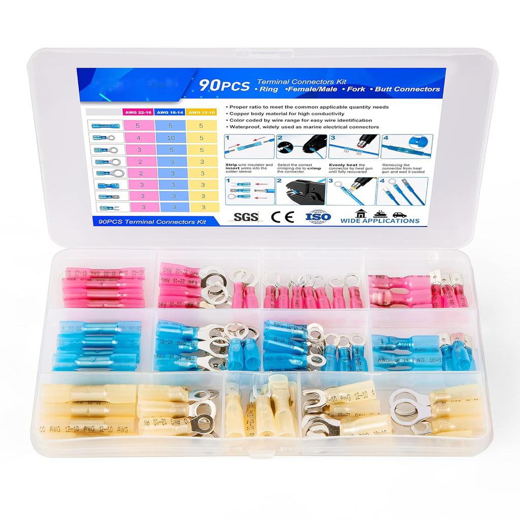 90шт термоусадочных соединителей для проводов, многоцелевой водонепроницаемый комплект клемм для электрических проводов, изолированные обжимные соединители с кольцом-вилкой