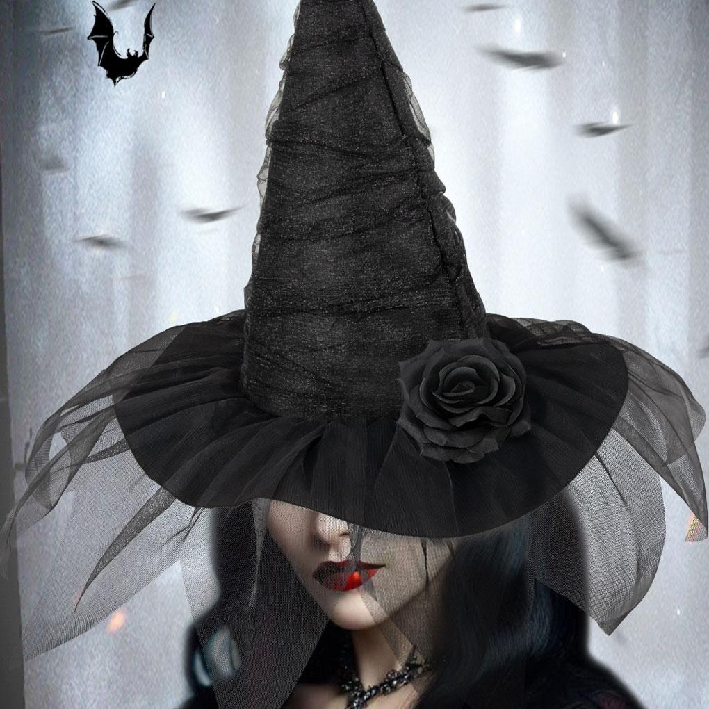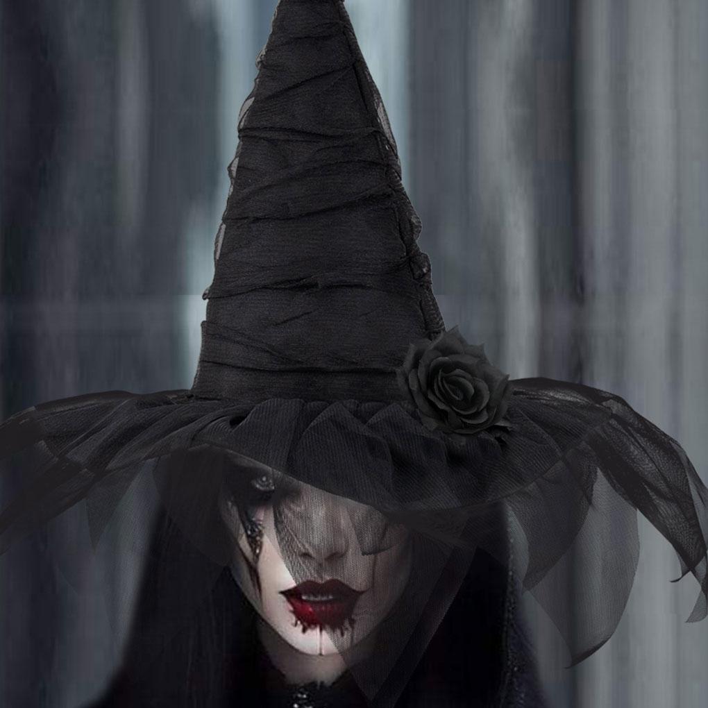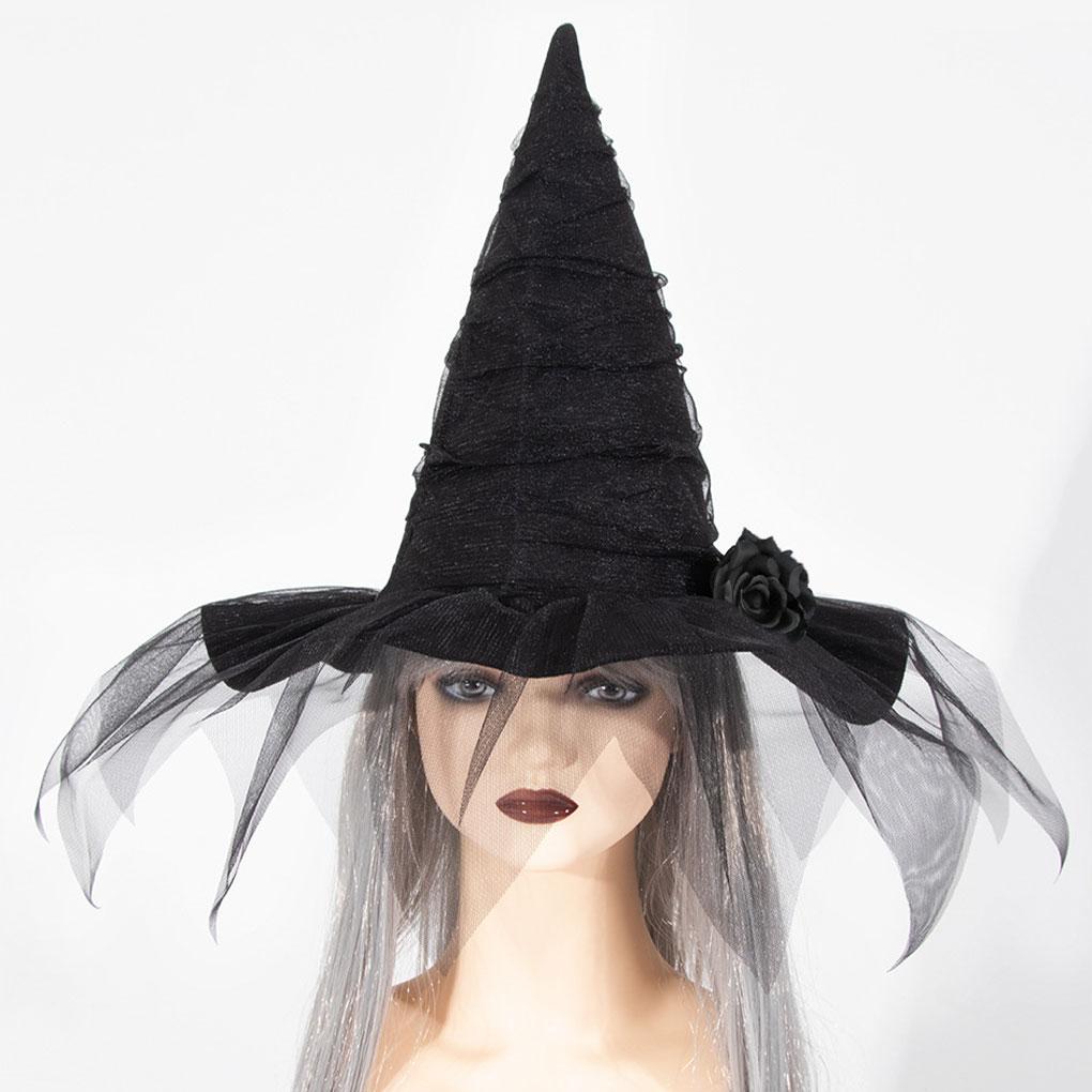 Черная большая остроконечная черная шляпа для взрослых и подростков, которая выделяется на вечеринках в честь Хэллоуина. Шляпа ведьмы