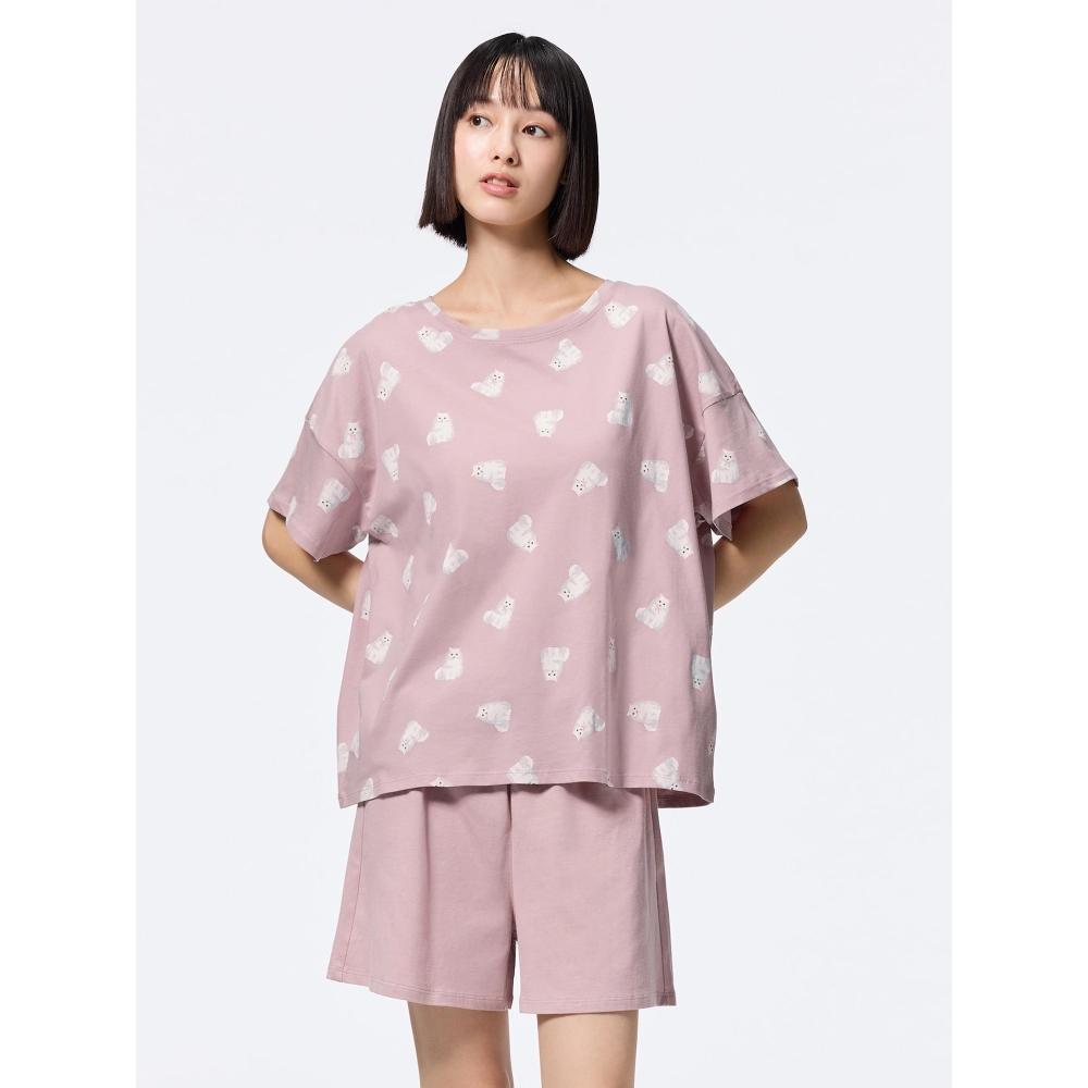 Представляем хлопковый цветной домашний костюм Uniqlo GU (Короткий рукав) с очаровательным кошачьим узором. Этот комплект изготовлен из 100% хлопка, обеспечивающего мягкую и свободную посадку, идеально подходящую для отдыха дома.. Топ имеет свободный силуэт, обеспечивающий дополнительный комфорт во время отдыха.