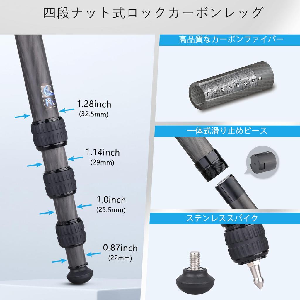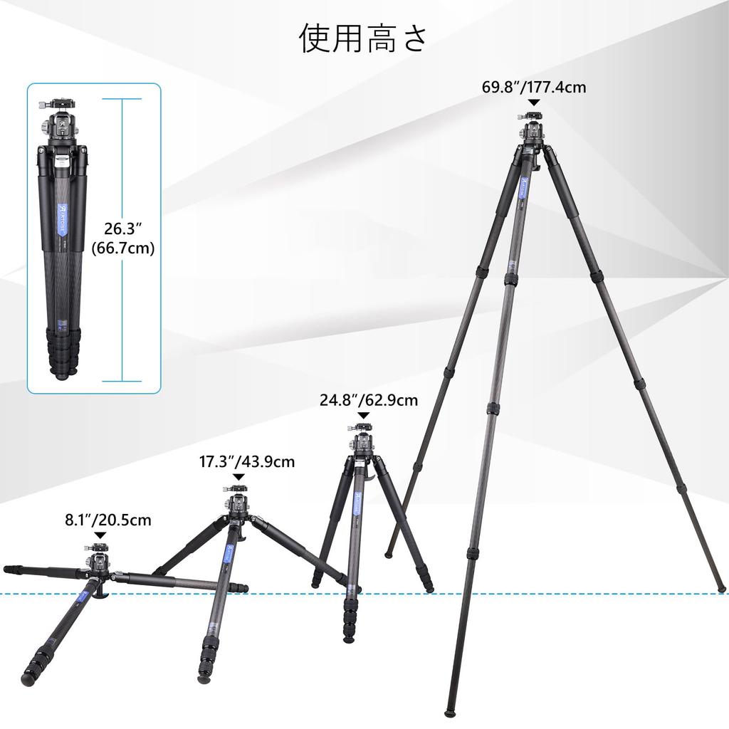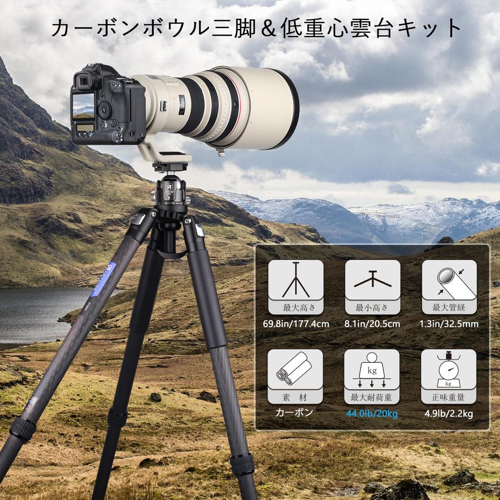 【Устойчивый штатив из углеродного волокна с трубкой диаметром 32,5 мм】Ножка из высококачественного углеродного волокна диаметром 32,5 мм обеспечивает высокую устойчивость, но весит всего 2,2 кг.. Шаровая головка диаметром 44 мм с низким центром тяжести имеет более высокую устойчивость, чем обычная шаровая головка.. Максимальная грузоподъемность — 20 кг.
