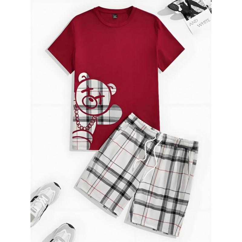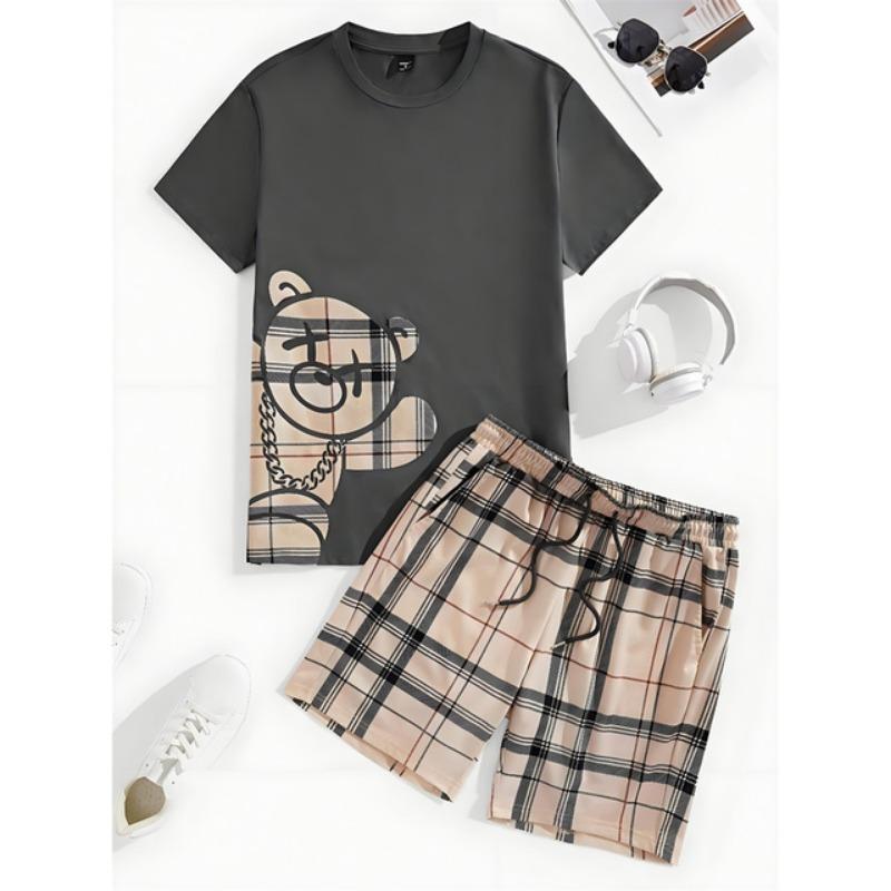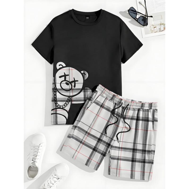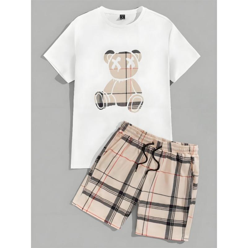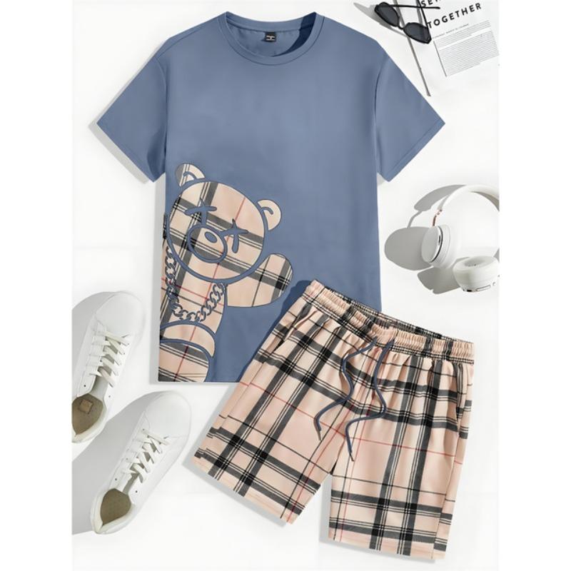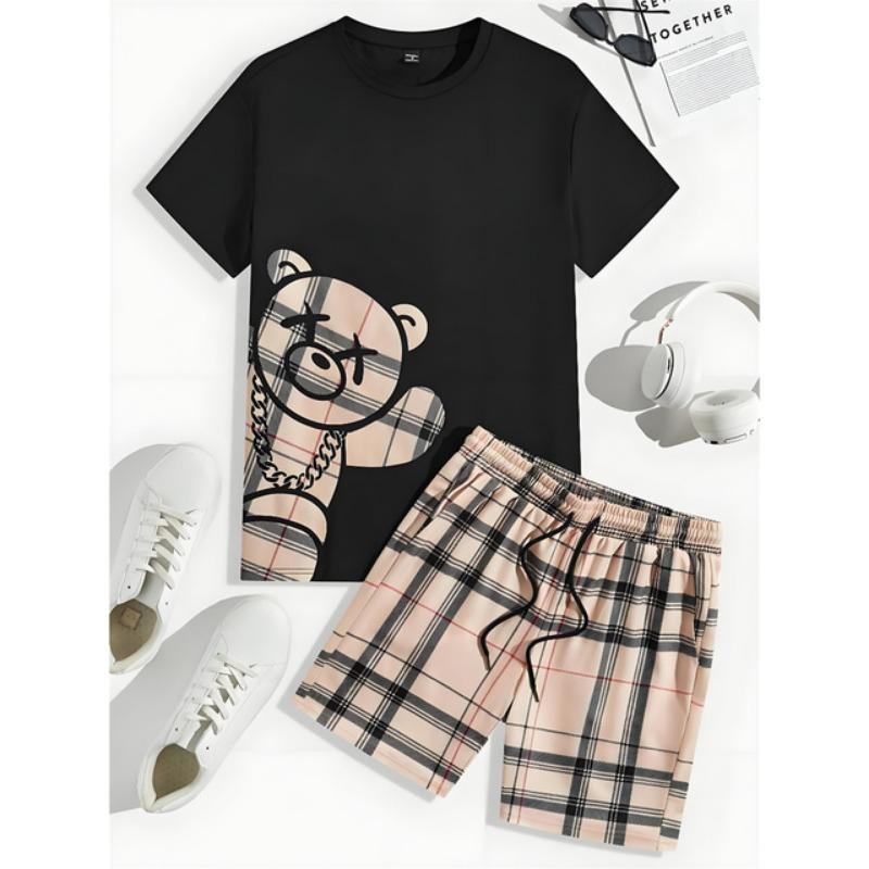 Комплект из 2 предметов, мужской повседневный комплект с принтом 3D Bear, мужской топ с короткими рукавами, клетчатый принт, мужские шорты, уличный модный комплект