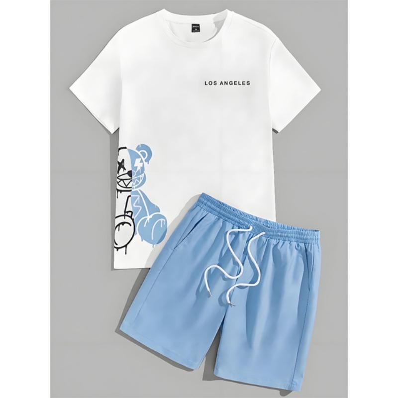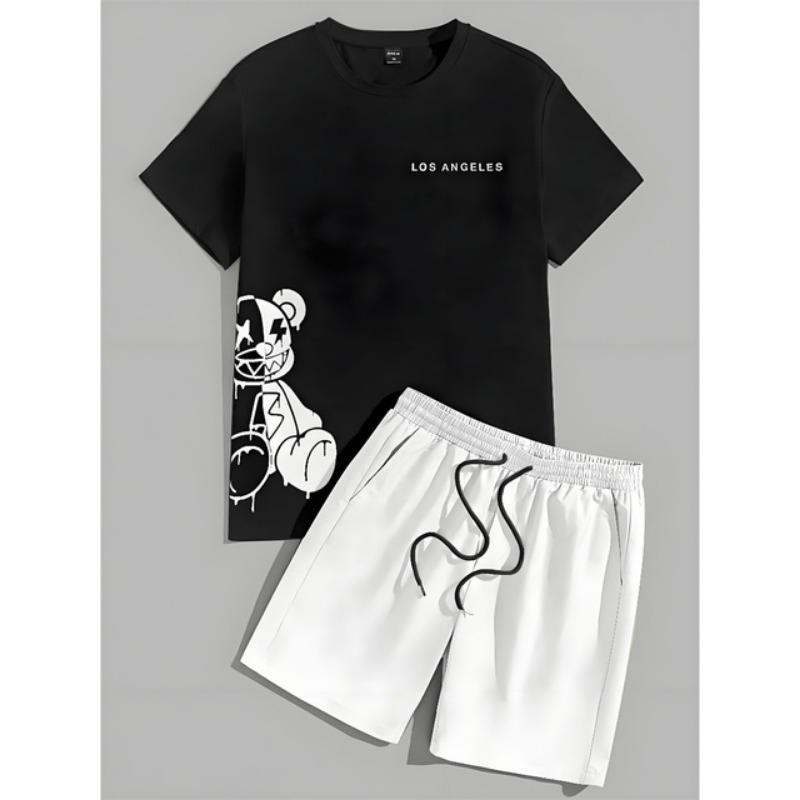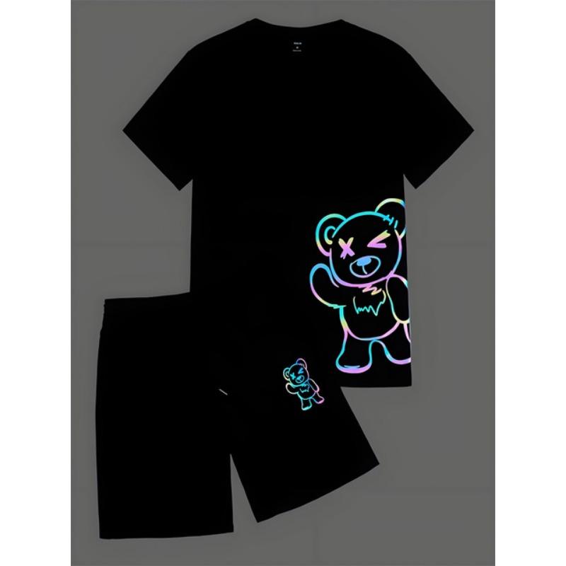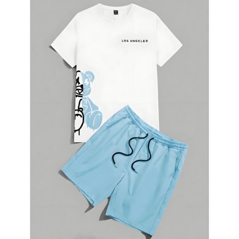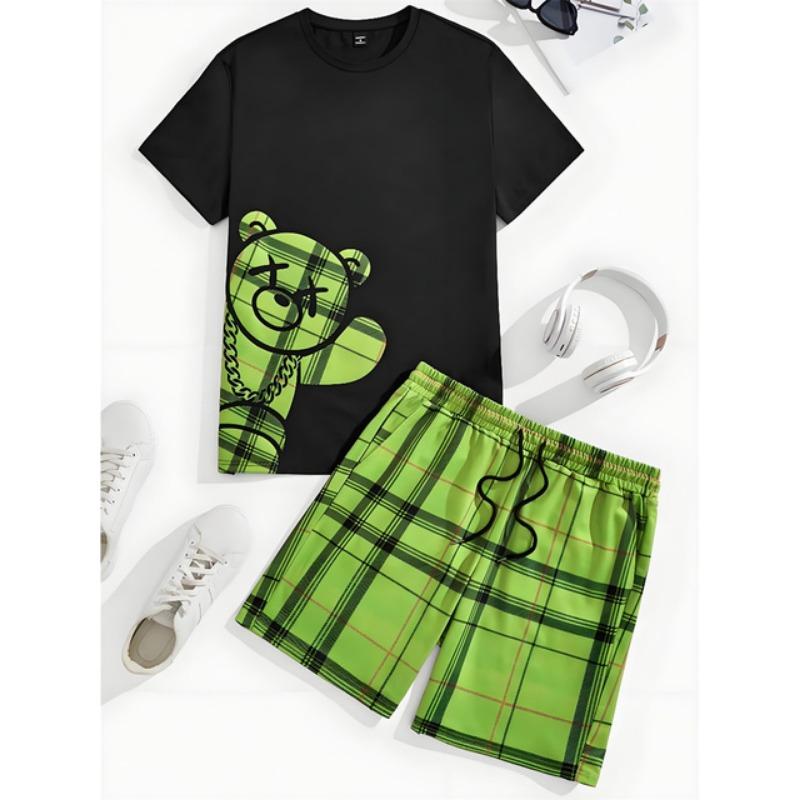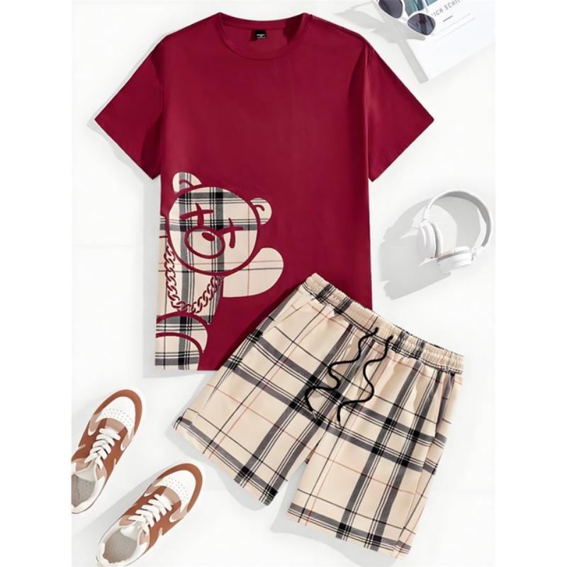 Комплект из 2 предметов, мужской повседневный комплект с принтом 3D Bear, мужской топ с короткими рукавами, клетчатый принт, мужские шорты, уличный модный комплект