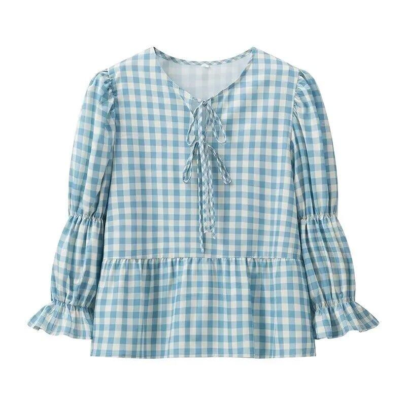 Рубашка в клетку с завязкой спереди и бантом, женская свободная, с круглым вырезом, с коротким рукавом, блузка, весна-лето, повседневные простые топы — купить товар онлайн с бесплатной доставкой до всему миру!
